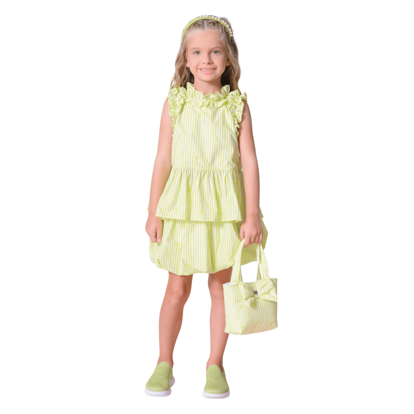 A Saia Short Balonê Listras Verde Pituchinhus é perfeita para compor looks delicados e modernos.