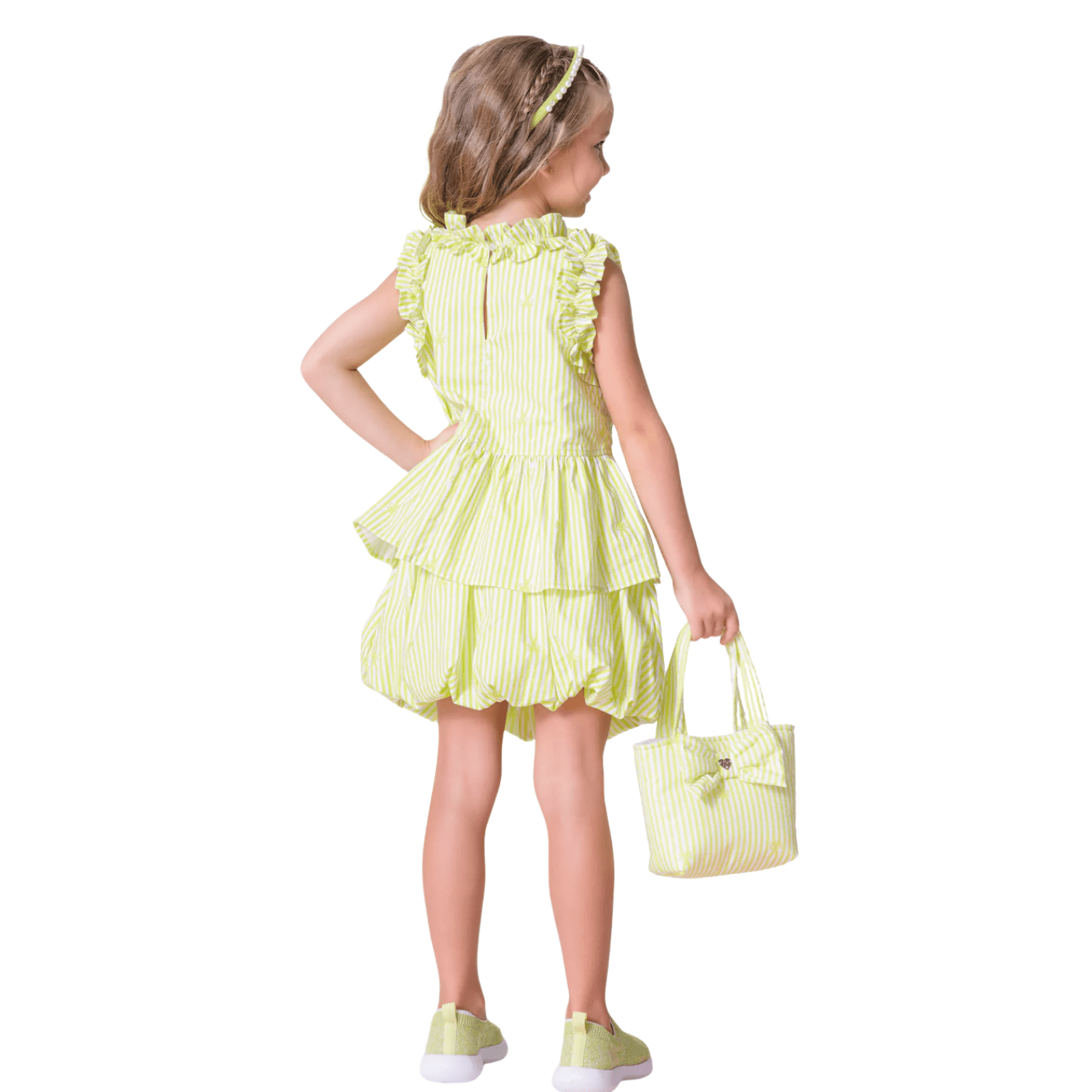 Confeccionada em tricoline de algodão leve e macio, traz a clássica estampa listrada verde e branca, combinando frescor e delicadeza.