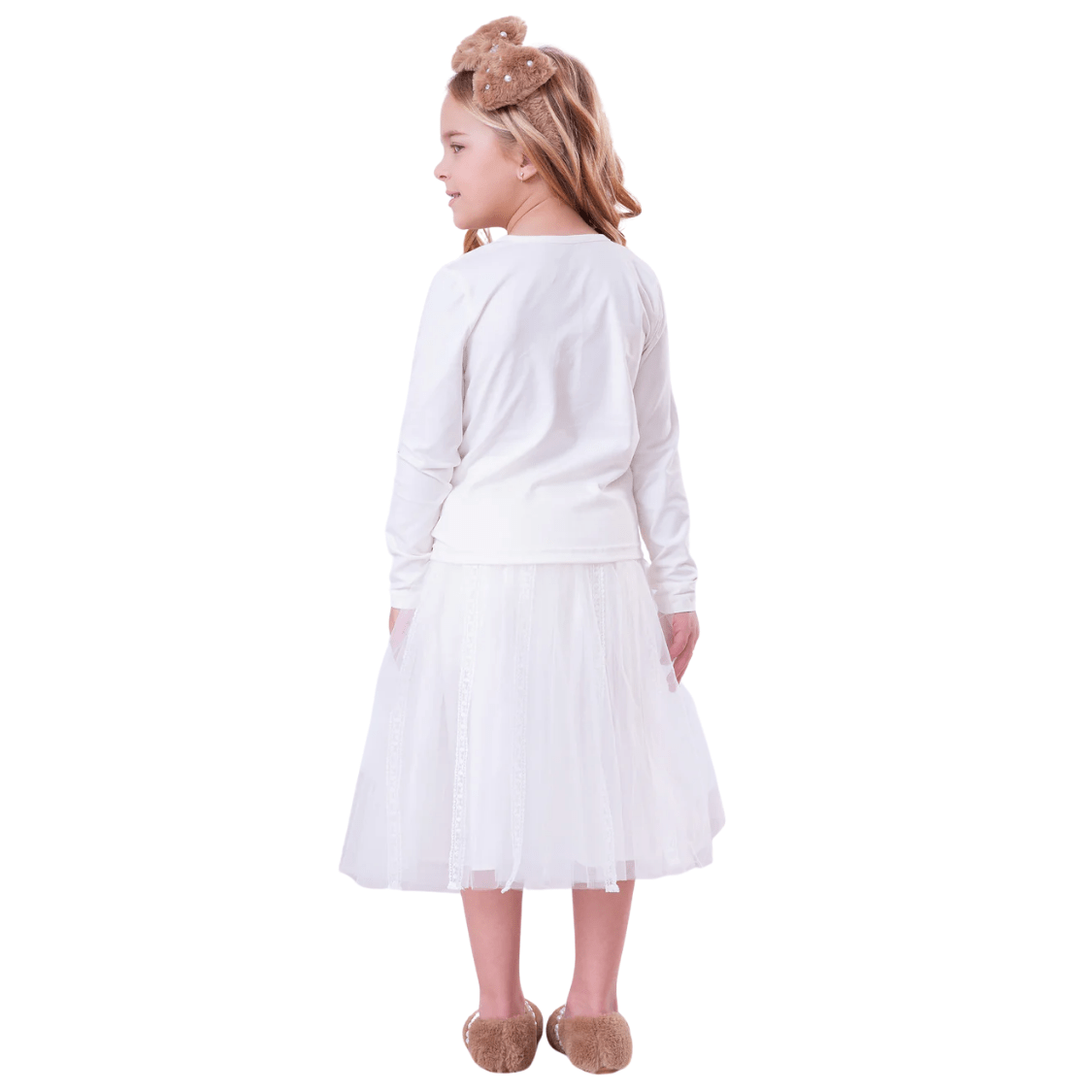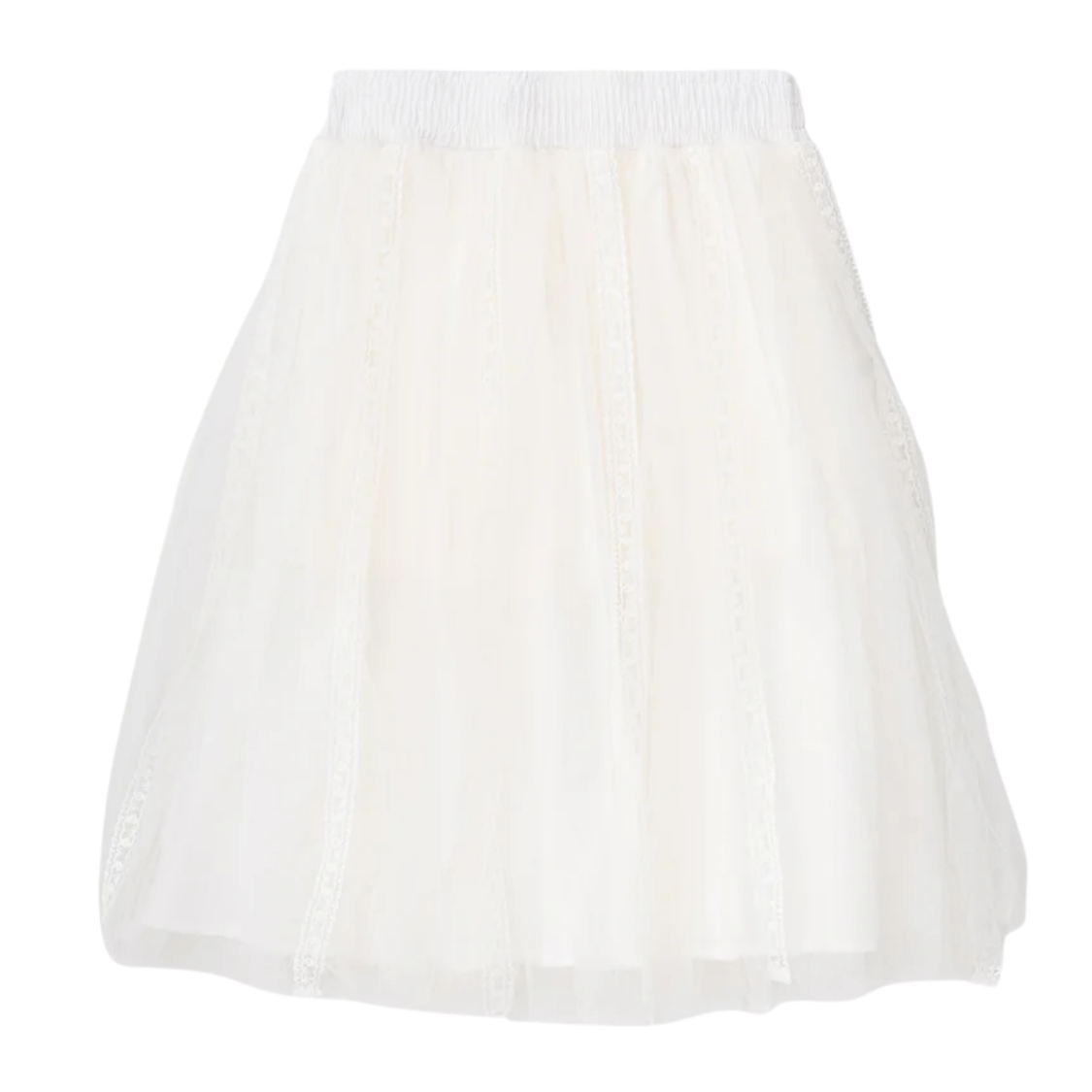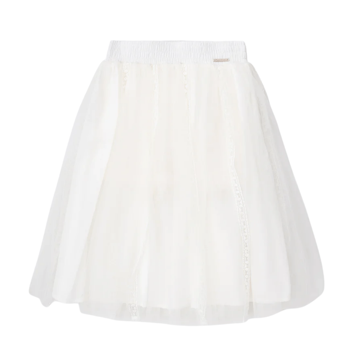 Confeccionada com camadas de tule leve e fluido, a saia apresenta aplicações de renda delicada, que adicionam um toque clássico e refinado ao visual. O caimento suave cria movimento e volume na medida certa, tornando a peça ideal para ocasiões especiais.