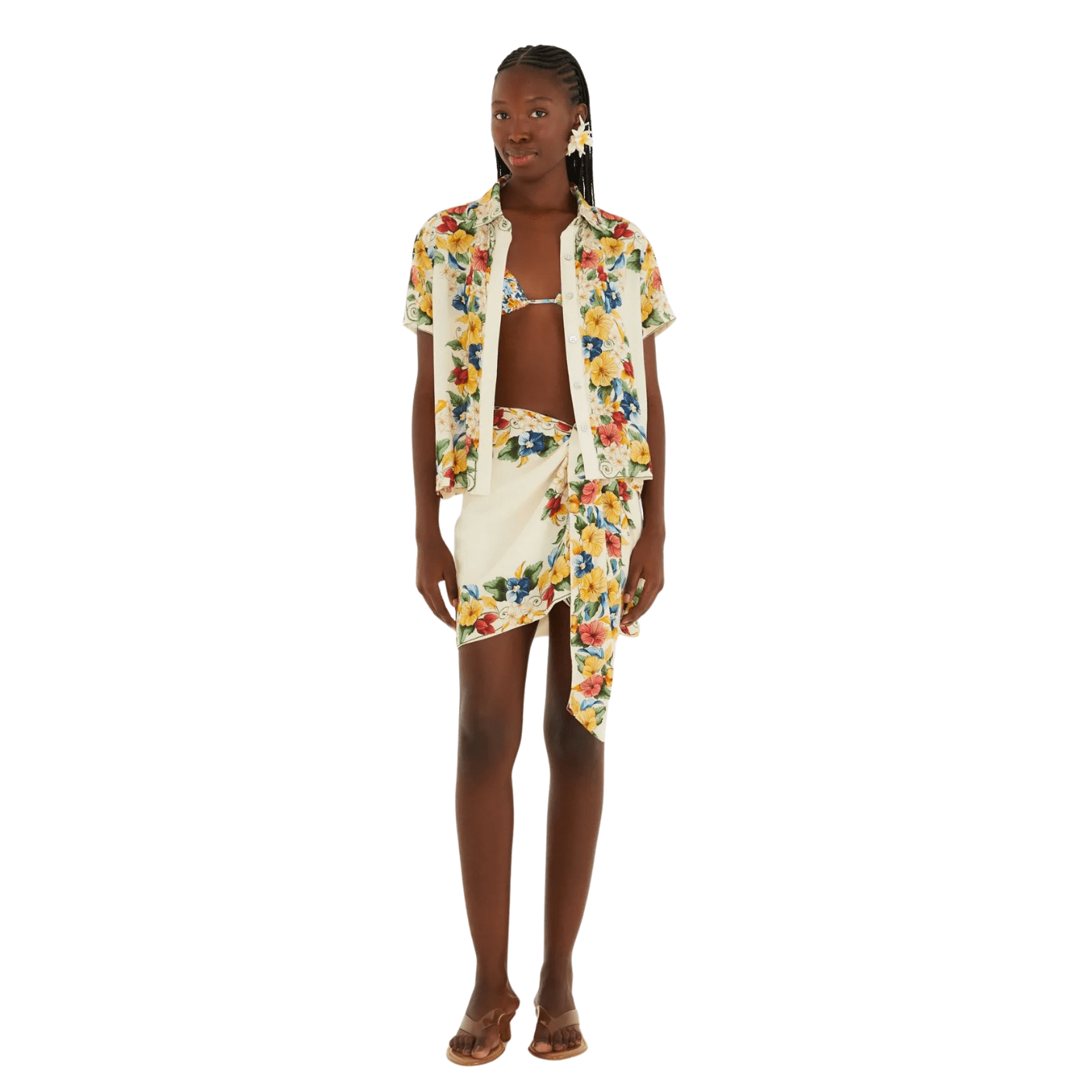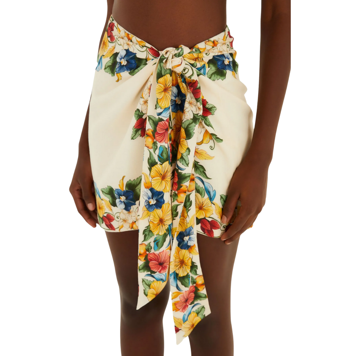 Com modelagem inspirada no estilo lenço, a peça apresenta amarração lateral que permite diferentes formas de uso, adicionando versatilidade e originalidade ao visual. Sua estampa Tropicalzinho combina flores vibrantes em tons de amarelo, azul, vermelho e verde sobre fundo bege, resultando em uma proposta alegre e cheia de personalidade — característica marcante da Farm Rio.