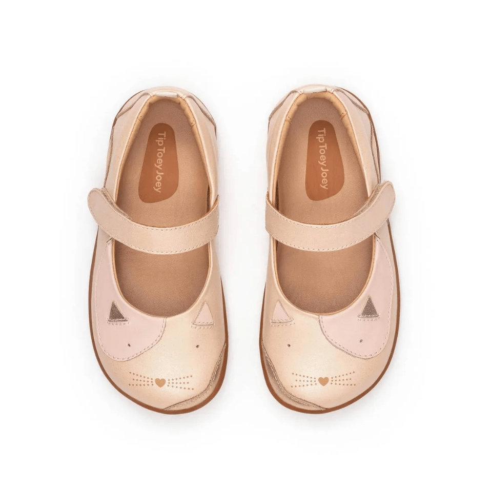 A Sapatilha Couro Kitten Candy Dream Metallic Tip Toey Joey combina tecnologia para o desenvolvimento saudável dos pés com um design delicado inspirado no universo lúdico infantil.