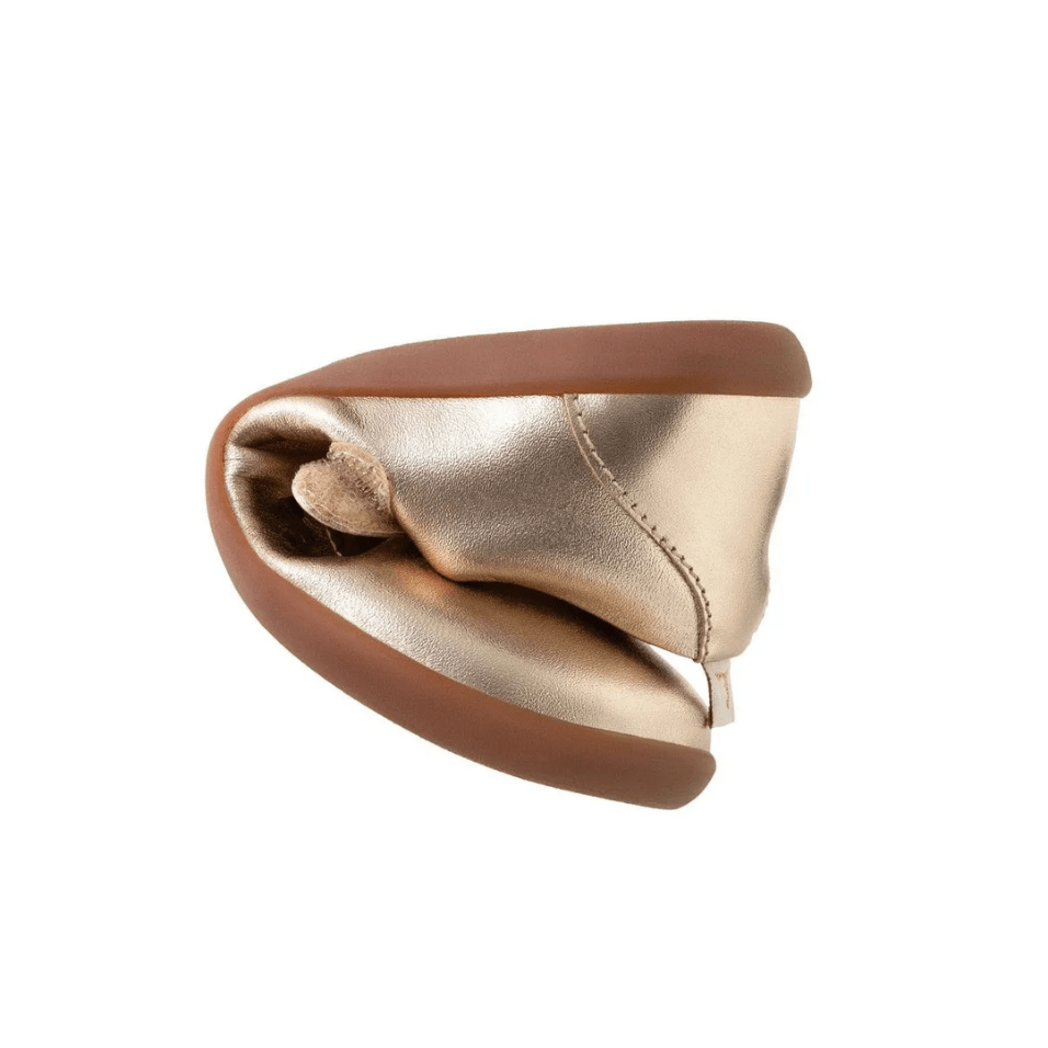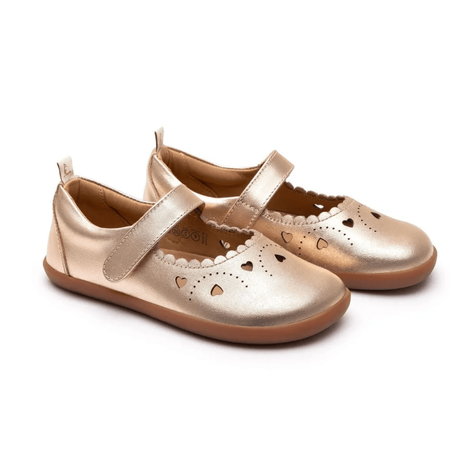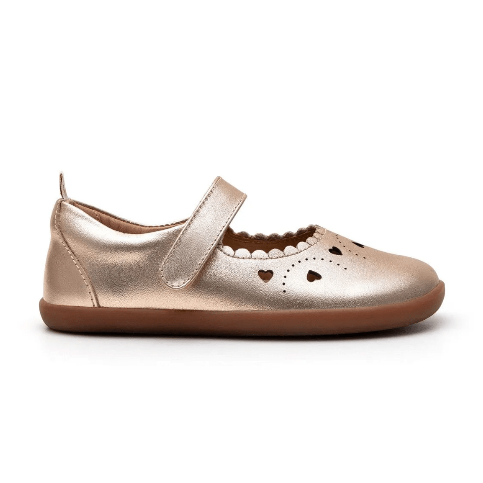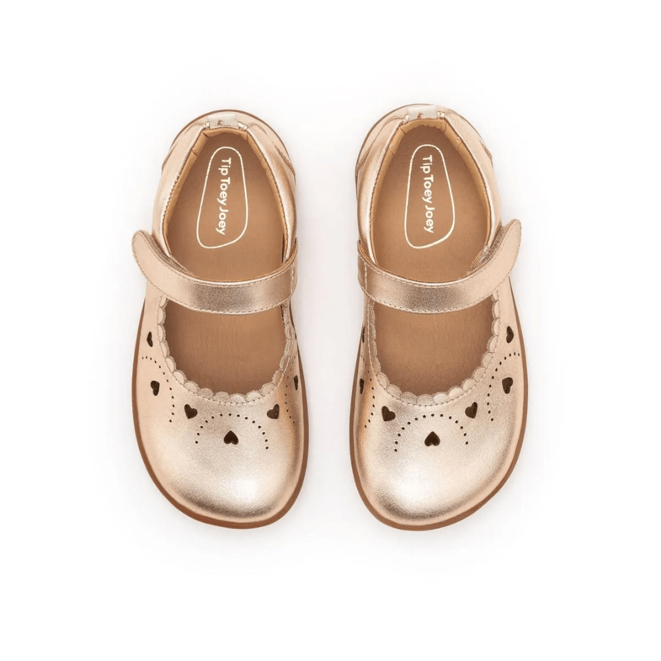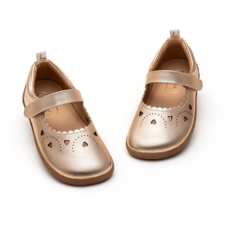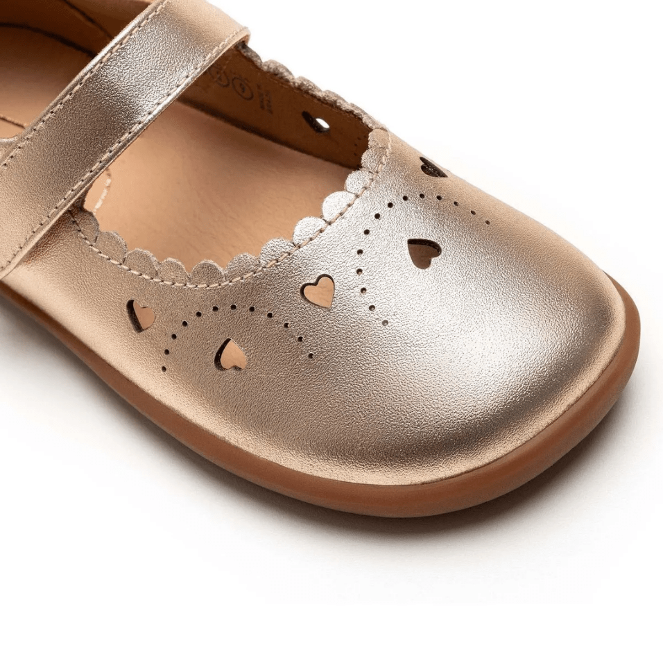 A Sapatilha Couro Sweetheart Metalic Salmon Tip Toey Joey combina design romântico com tecnologia pensada para o desenvolvimento saudável infantil.