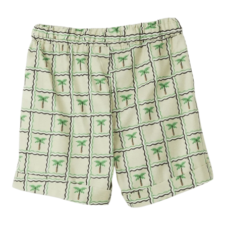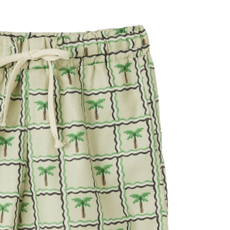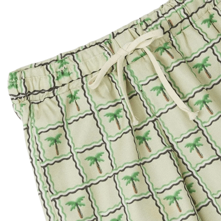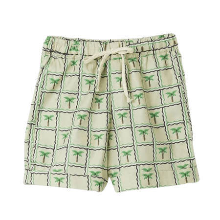 O Short Coco Xadrez Bento traz uma estampa charmosa de coqueirinhos com padronagem xadrez em tons suaves de bege e verde, perfeito para composições leves e modernas.