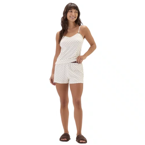 Confeccionado em malha macia e confortável, o conjunto é composto por blusa de alcinha com acabamento delicado no decote e short coordenado com modelagem leve e soltinha. A estampa clássica de poás marrom sobre o fundo off white traz charme atemporal e feminilidade.
