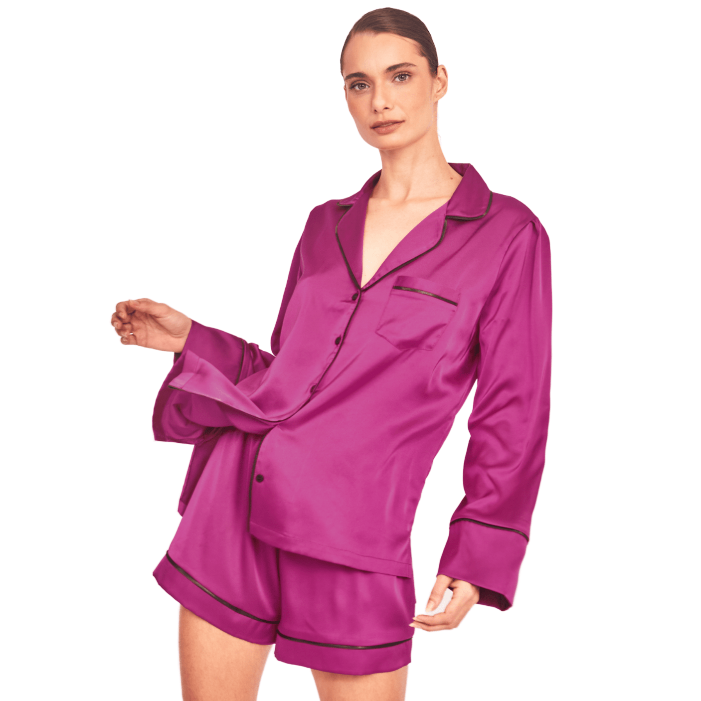 A blusa possui modelagem aberta, com abotoamento frontal que adiciona praticidade e charme ao conjunto. Os botões delicadamente aplicados e o caimento fluido do cetim valorizam a silhueta com conforto e leveza. O shorts, com elástico na cintura, garante ajuste ideal e liberdade de movimento, sem perder a elegância.