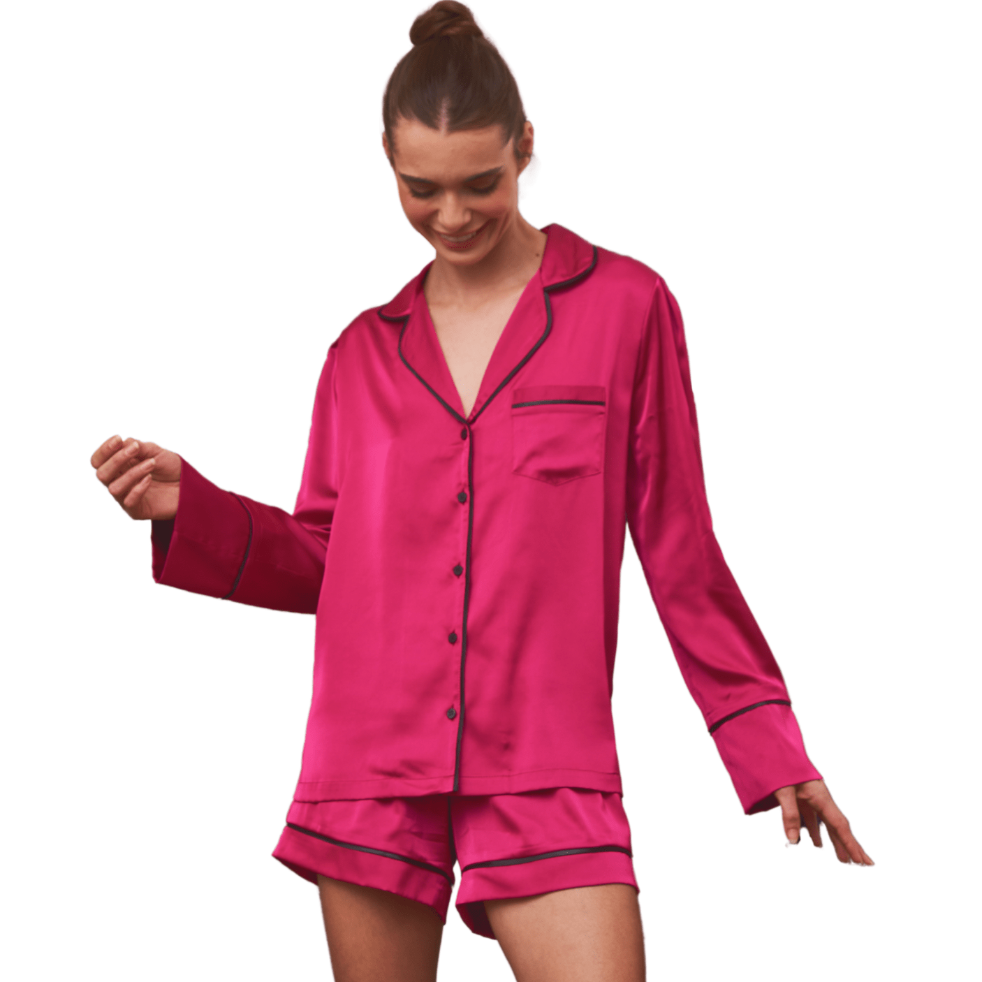 O tom fúcsia vibrante é moderno e feminino, ideal para quem ama cores marcantes e looks que fogem do óbvio, mesmo em casa. O acabamento em debrum preto cria um contraste elegante, trazendo sofisticação ao design e realçando ainda mais a beleza da peça. Cada costura e detalhe foram pensados para valorizar o visual com um toque refinado e contemporâneo.