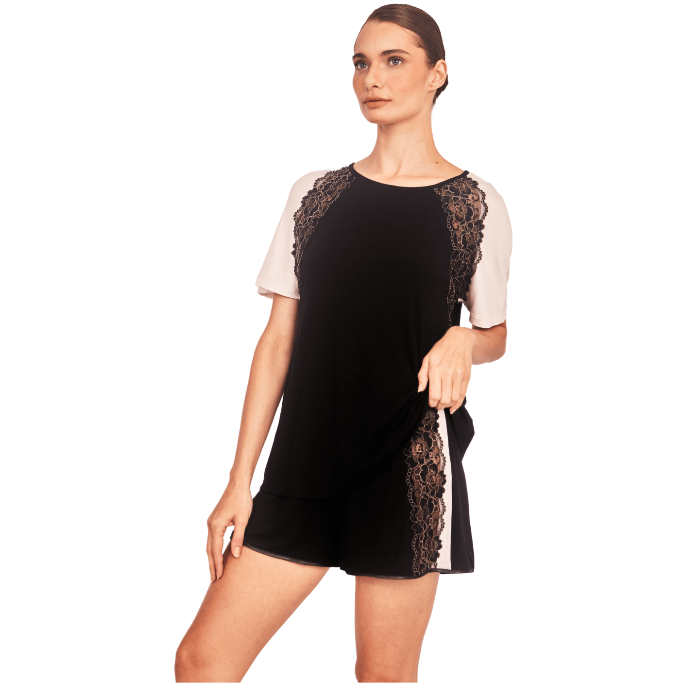 A blusa de manga curta possui um caimento fluido e confortável, valorizando a silhueta com suavidade. O destaque fica por conta da renda delicada, aplicada estrategicamente nas mangas e no decote, adicionando um toque romântico e sofisticado ao visual. Já o shorts acompanha o design refinado, com cintura elástica para ajuste perfeito e detalhes em renda que reforçam a identidade feminina e envolvente da peça.