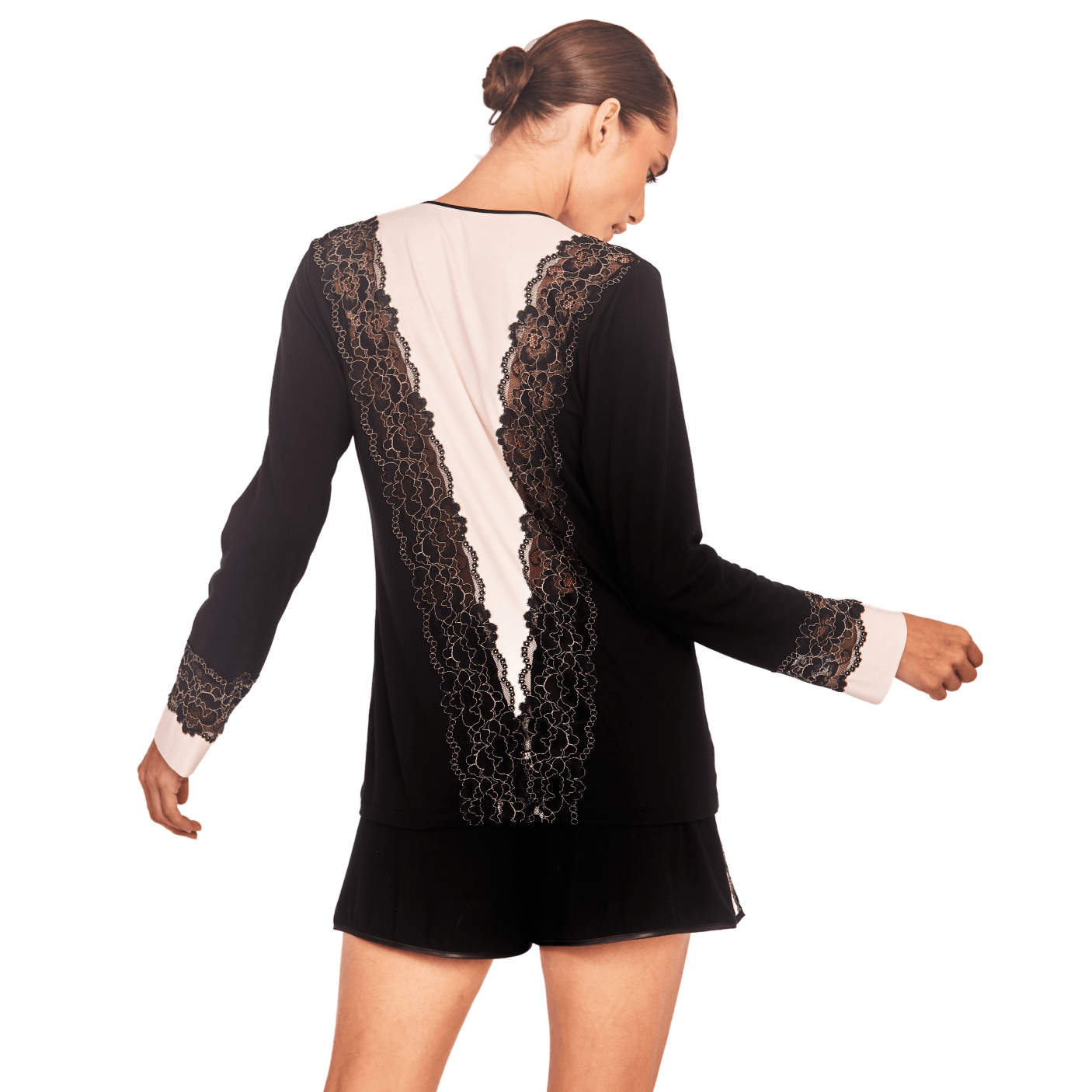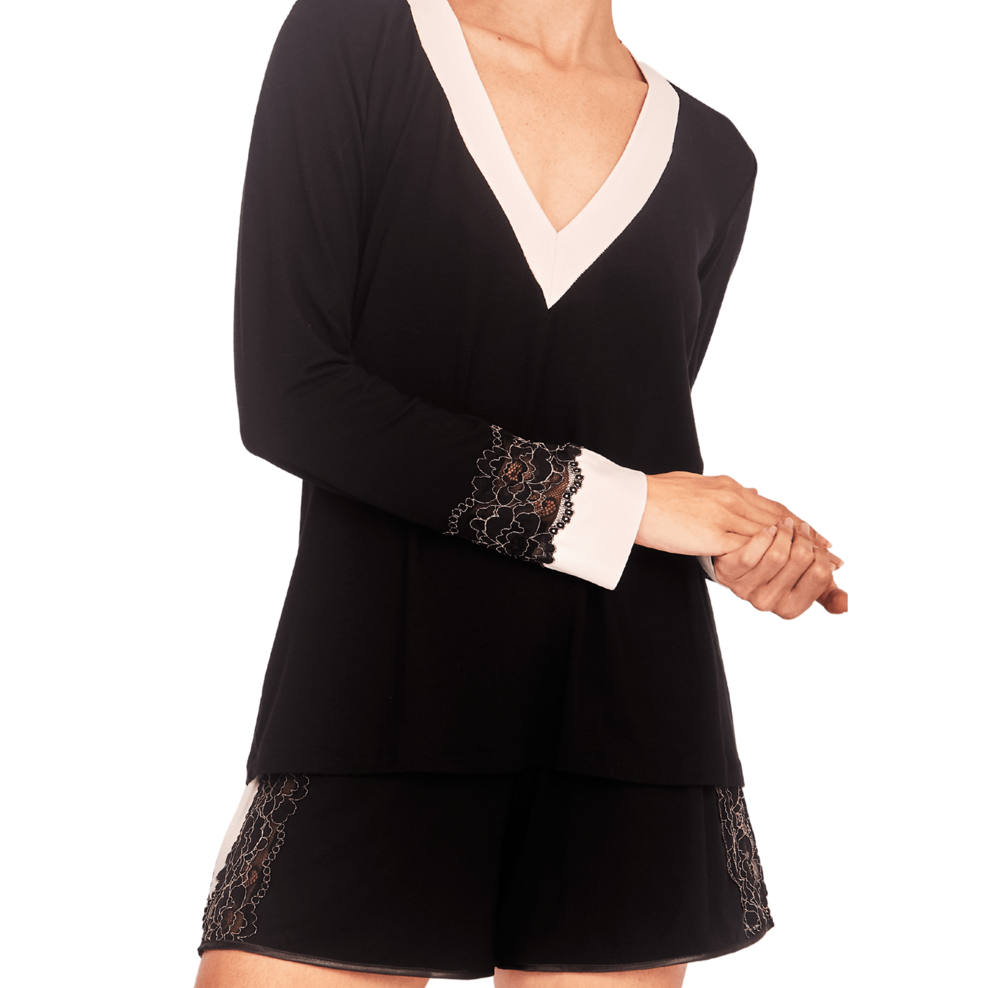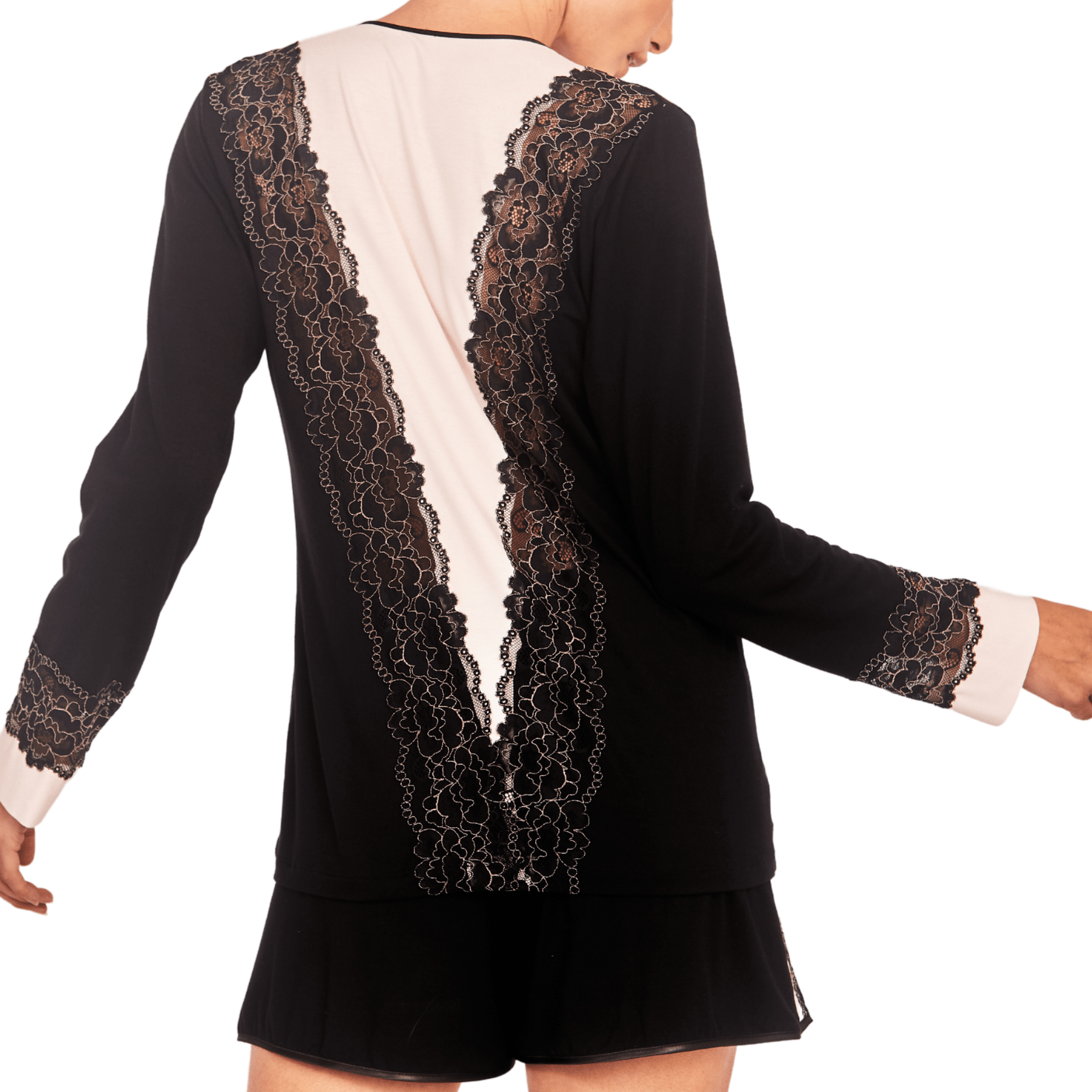 A blusa de manga longa possui um caimento fluido e confortável, valorizando a silhueta com suavidade. O destaque fica por conta da renda delicada, aplicada estrategicamente nas mangas e no decote, adicionando um toque romântico e sofisticado ao visual. Já o shorts acompanha o design refinado, com cintura elástica para ajuste perfeito e detalhes em renda que reforçam a identidade feminina e envolvente da peça.