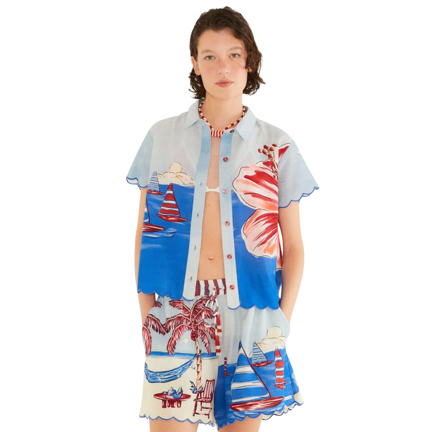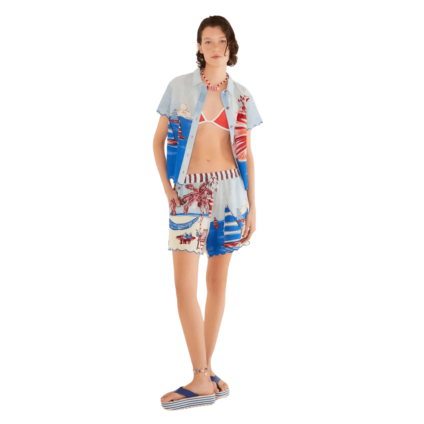 Leveza, cor e a poesia do litoral brasileiro em cada detalhe! O Short Festonê Diário de Verão Farm é perfeito para quem ama peças confortáveis, estilosas e cheias de personalidade. Com estampa exclusiva que retrata cenas de praia – barcos à vela, coqueiros, redes e cadeiras na areia – ele transmite a energia leve e alegre do verão.