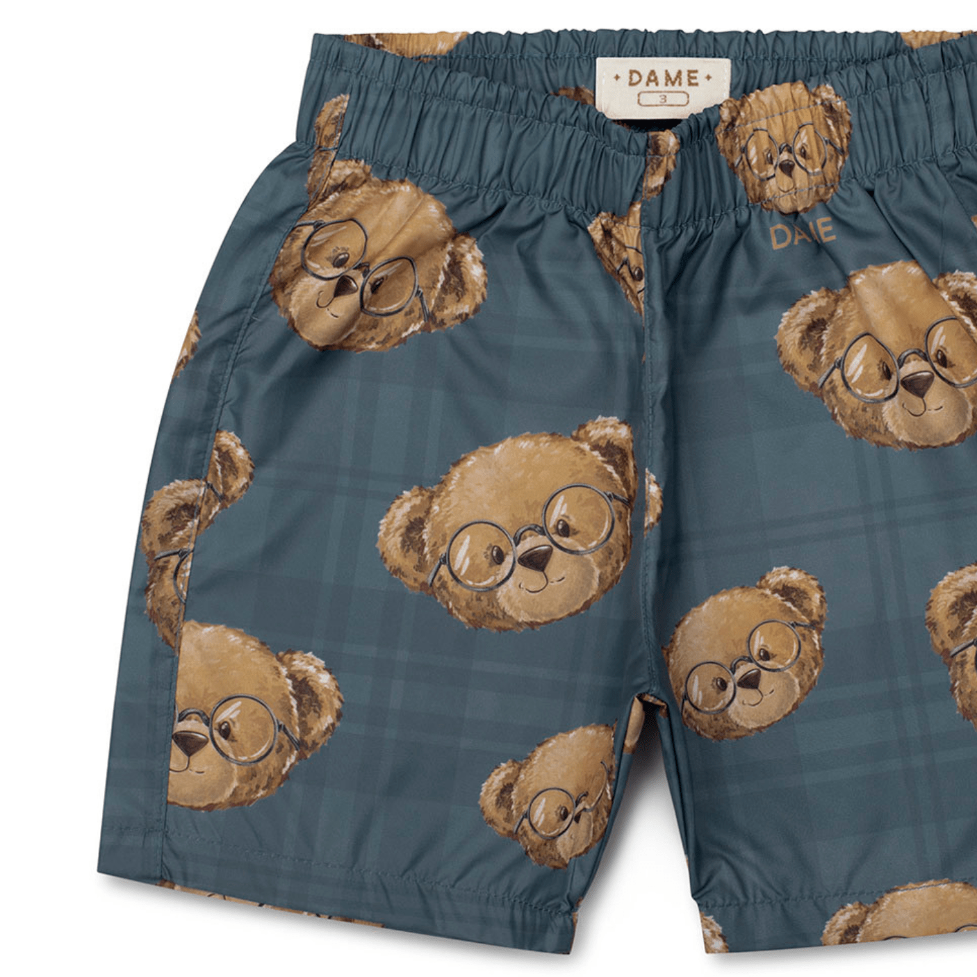 Com estampa exclusiva de ursinhos Teddy com óculos — um charme! — sobre fundo xadrez azul, o short une conforto e originalidade. Possui cós com elástico e amarração funcional, proporcionando ajuste ideal e liberdade para se movimentar.
