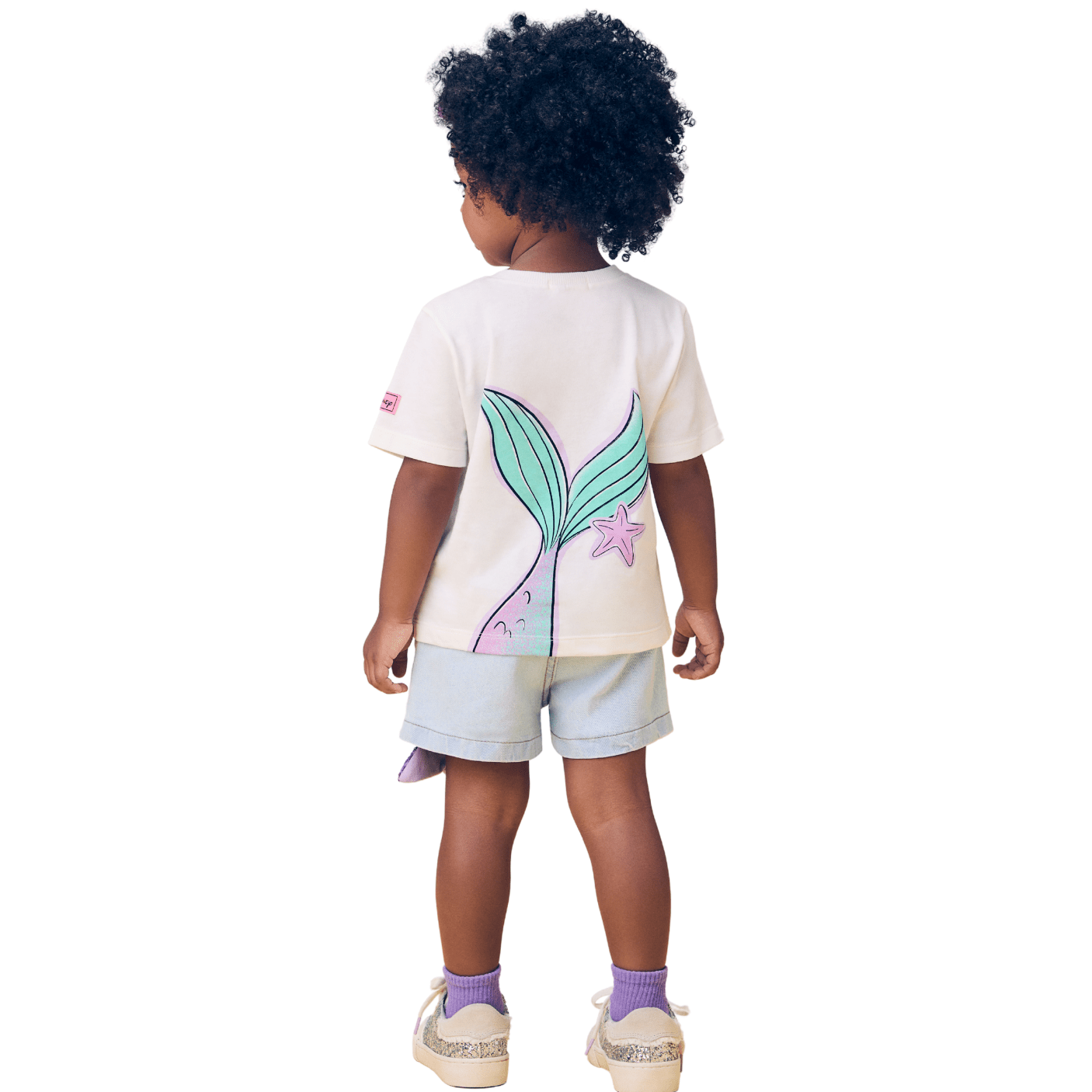 O grande destaque fica por conta da aplicação em paetê formando uma cauda de sereia, inspirada na icônica personagem Ariel, de A Pequena Sereia. O brilho dos paetês adiciona um toque glam e lúdico, transformando a peça em um item especial para o guarda-roupa infantil.