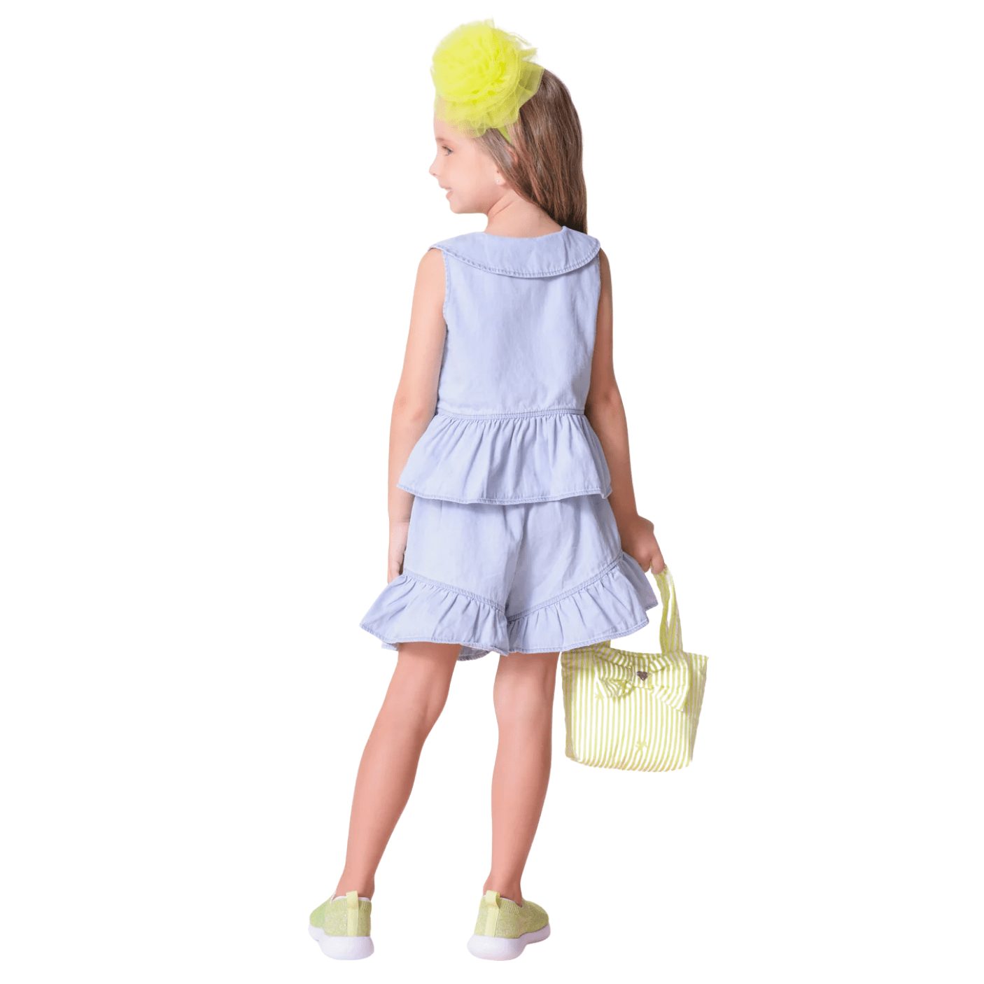 Feito em jeans leve e macio, ele garante liberdade de movimento e um visual delicado, ideal para acompanhar as pequenas em dias ensolarados.
