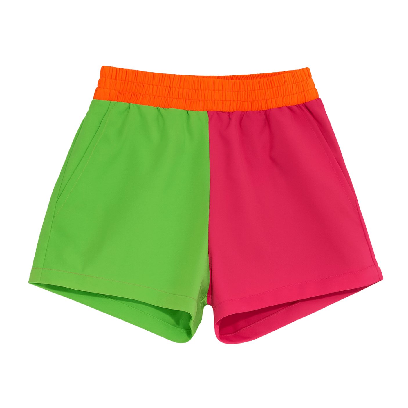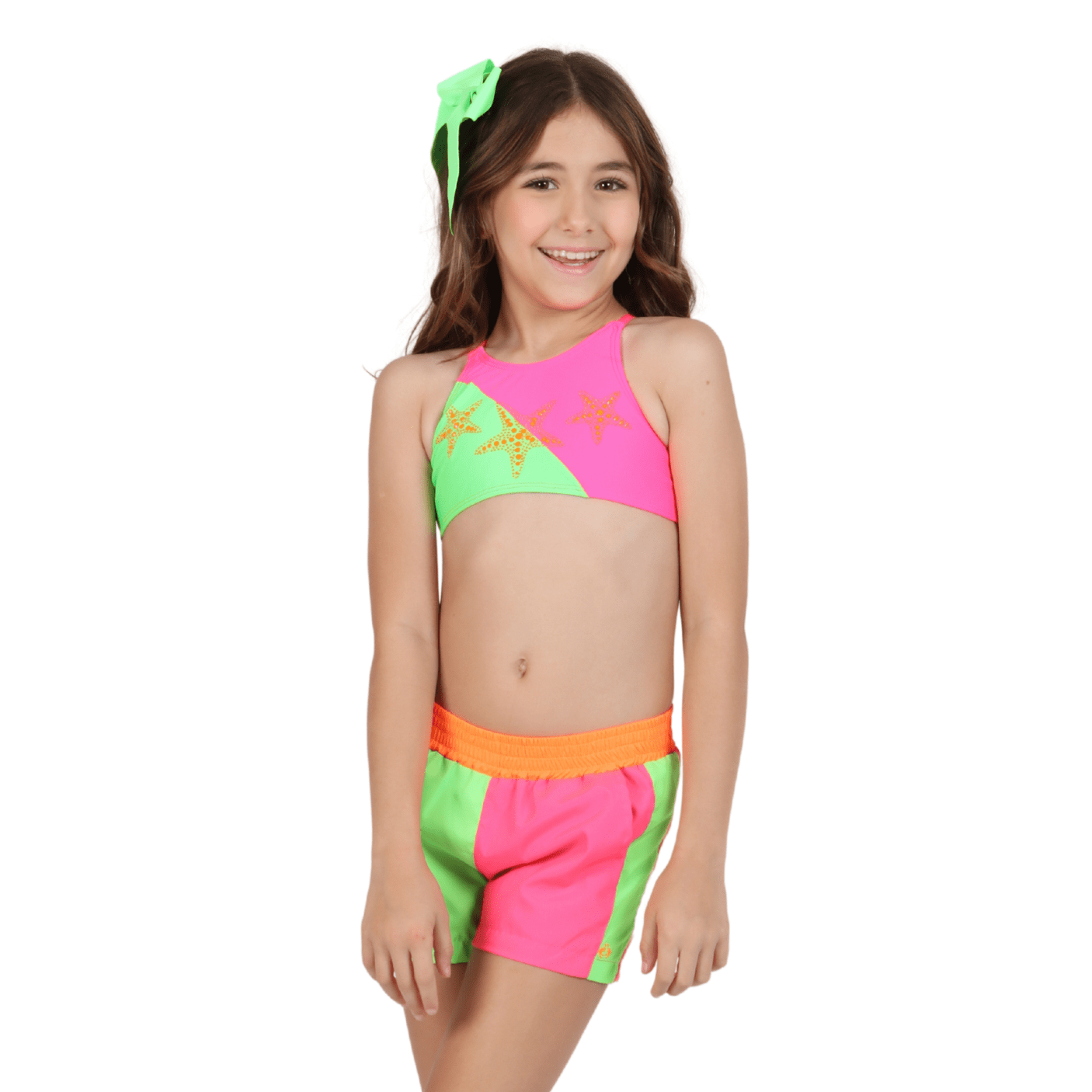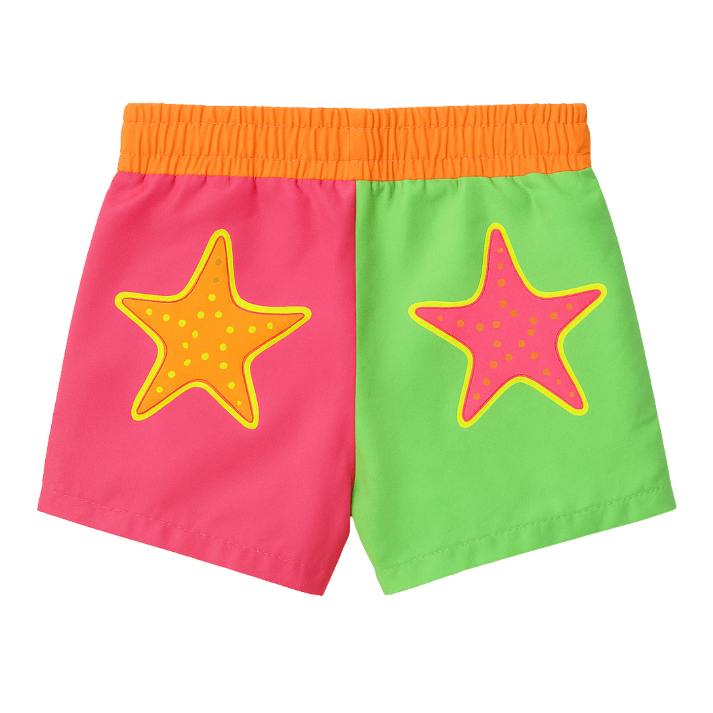 O design bicolor, com uma perna em rosa e outra em verde neon, é ainda mais encantador graças à aplicação de estrelas contrastantes, que traz um toque lúdico e moderno. O cós elástico oferece ajuste confortável e seguro, ideal para brincar, passear ou curtir dias ensolarados na praia e piscina.