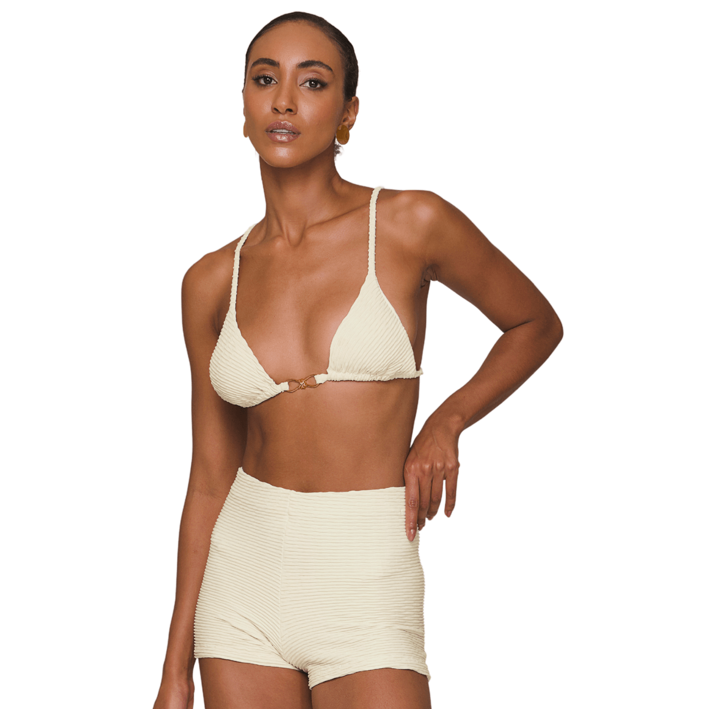 Com modelagem hot pants, o shorts traz inspiração retrô e ao mesmo tempo atual, valorizando a silhueta com muito charme. O tom off white neutro é elegante e atemporal, permitindo múltiplas combinações com biquínis, maiôs ou até mesmo peças casuais para além da praia e piscina. Seu design minimalista e sofisticado faz dele um curinga indispensável no guarda-roupa feminino.