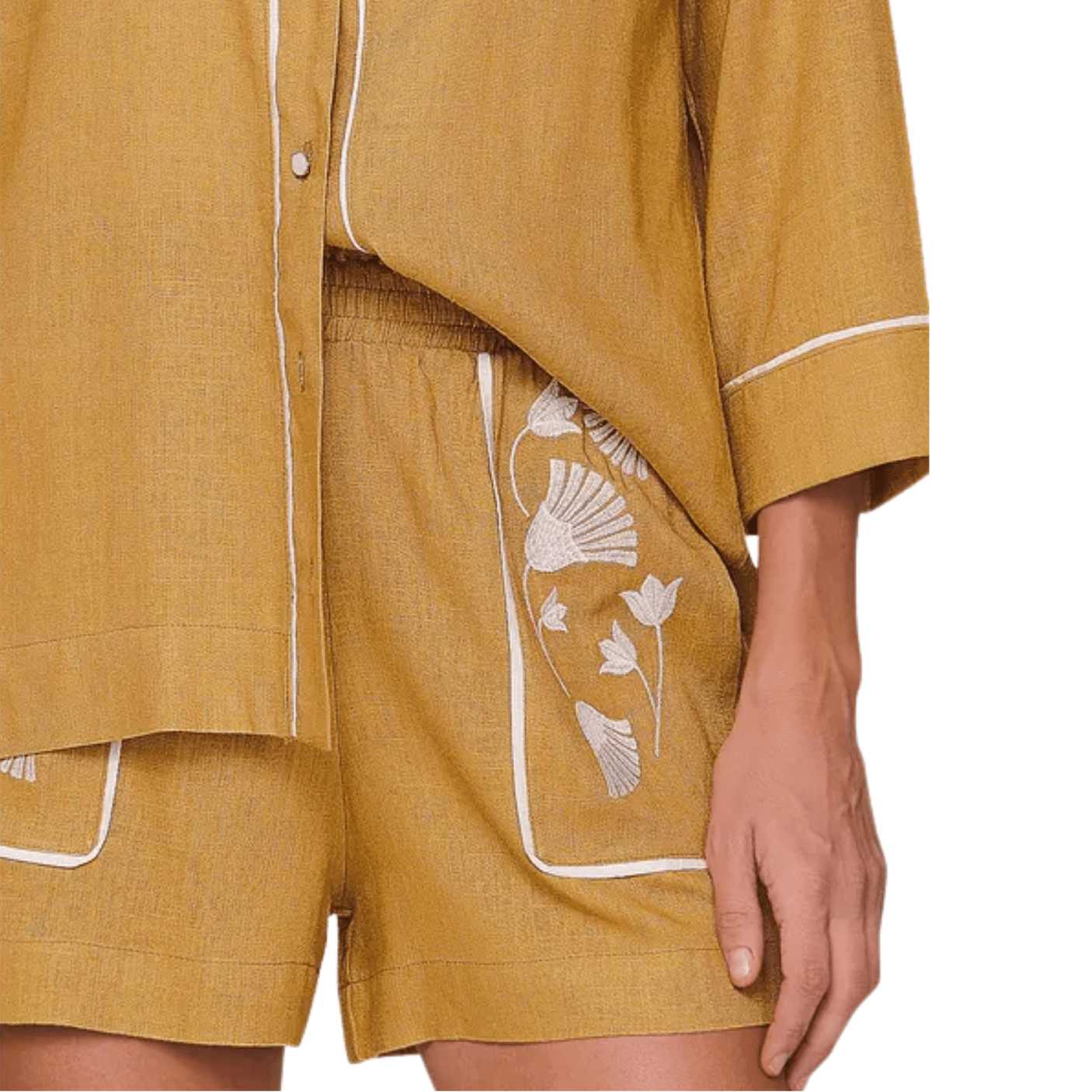 Com modelagem soltinha e cintura de cós elástico, o shorts garante caimento confortável e ajuste prático. O destaque fica para os bordados Papyrus brancos nas laterais, que trazem inspiração natural e delicadeza ao design, reforçando a proposta sofisticada da coleção. O tom âmbar terroso é moderno e versátil, ideal para combinações com peças neutras ou estampadas.