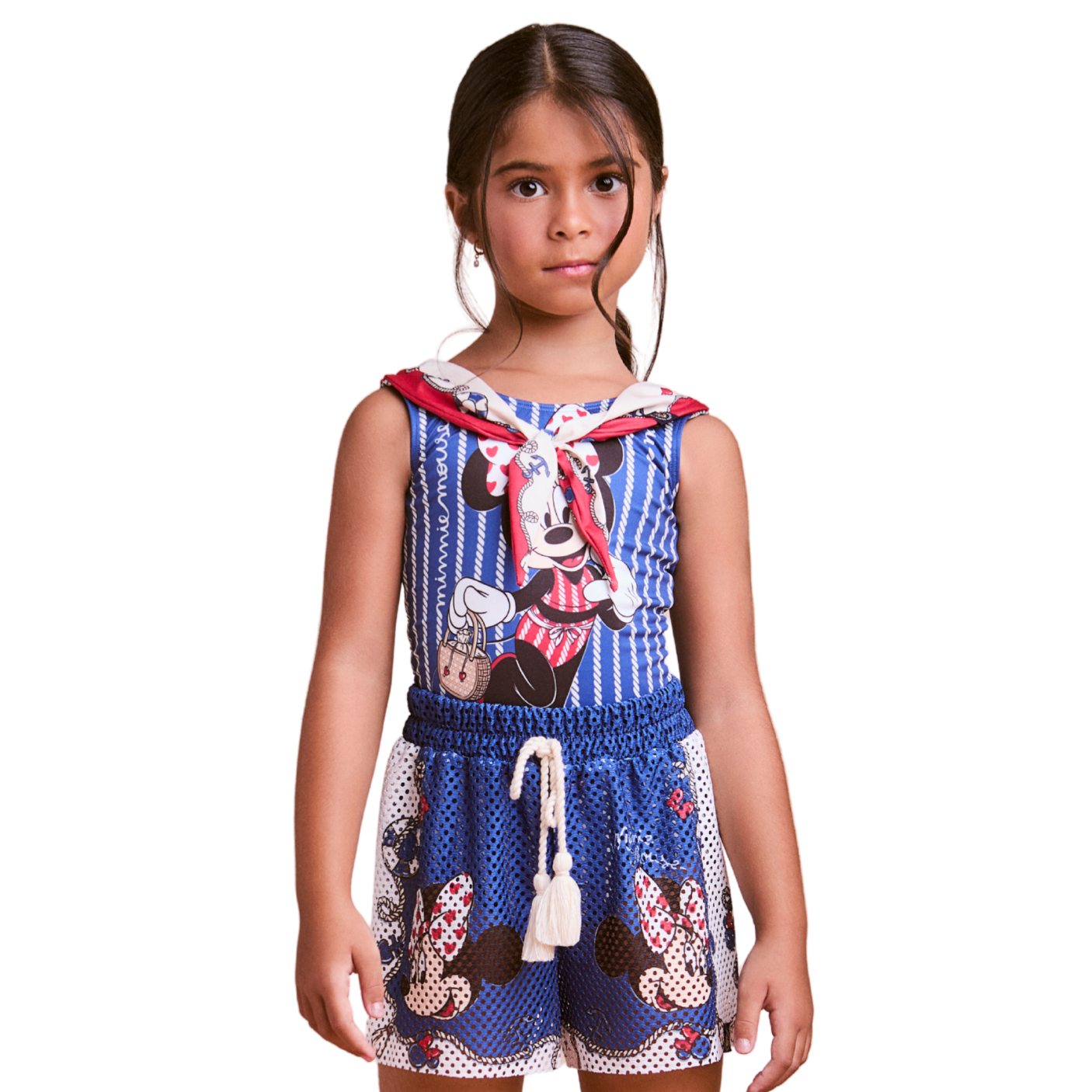 Confeccionado em tecido leve e fluido, o shorts possui cintura alta com cós elástico franzido e ajuste com cordão trançado, finalizado com ponteiras e tassels, garantindo caimento confortável e seguro. A estampa traz a Minnie em diferentes posições, com elementos navy como âncoras, cordas e poás, deixando a peça ainda mais especial.