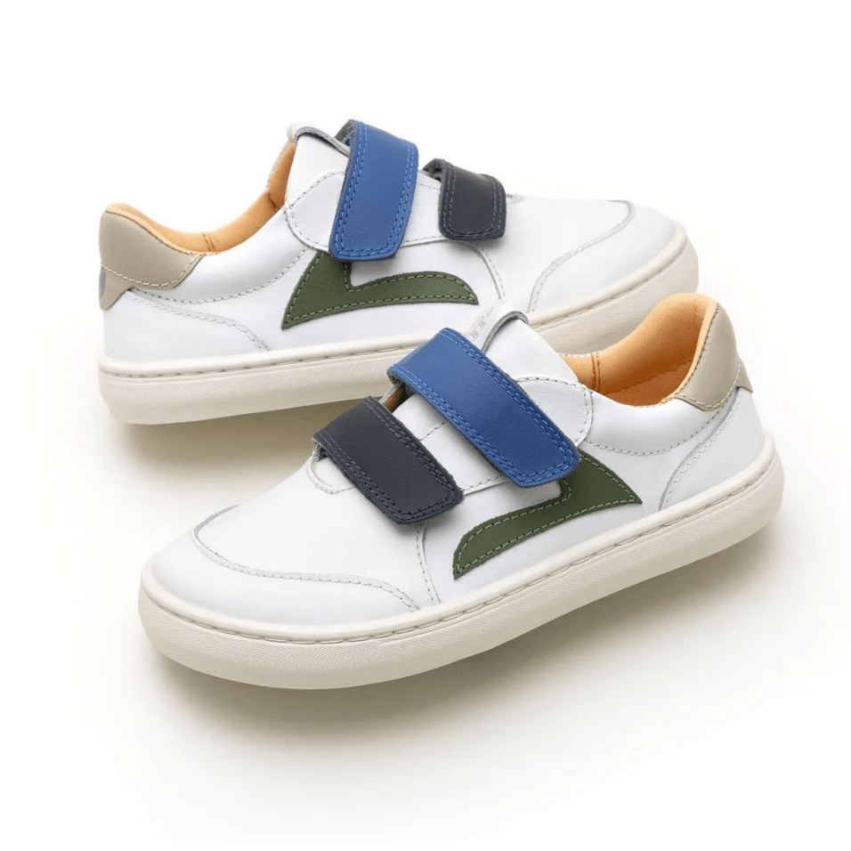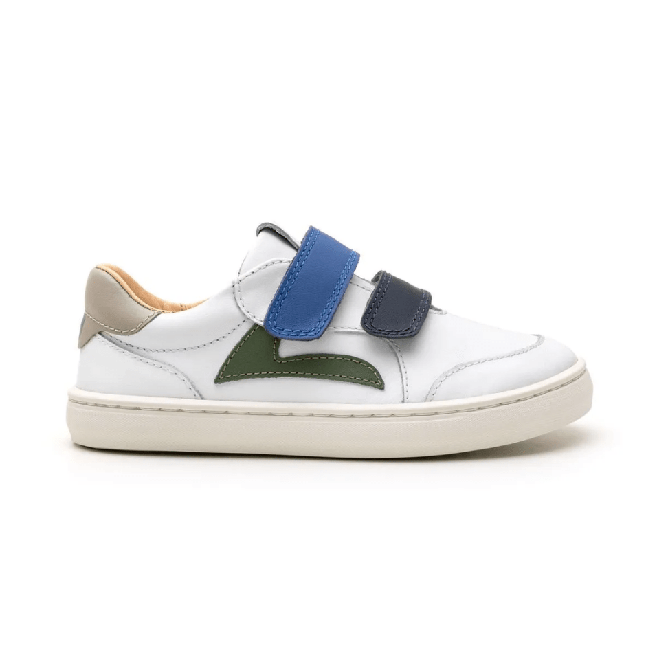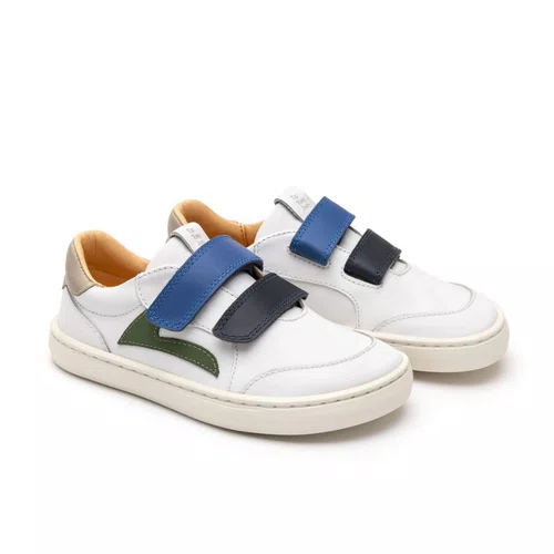 Com base branca em couro macio e detalhes em navy e azul, o modelo traz um visual moderno e versátil, perfeito para meninos que precisam de mobilidade sem abrir mão de estilo.