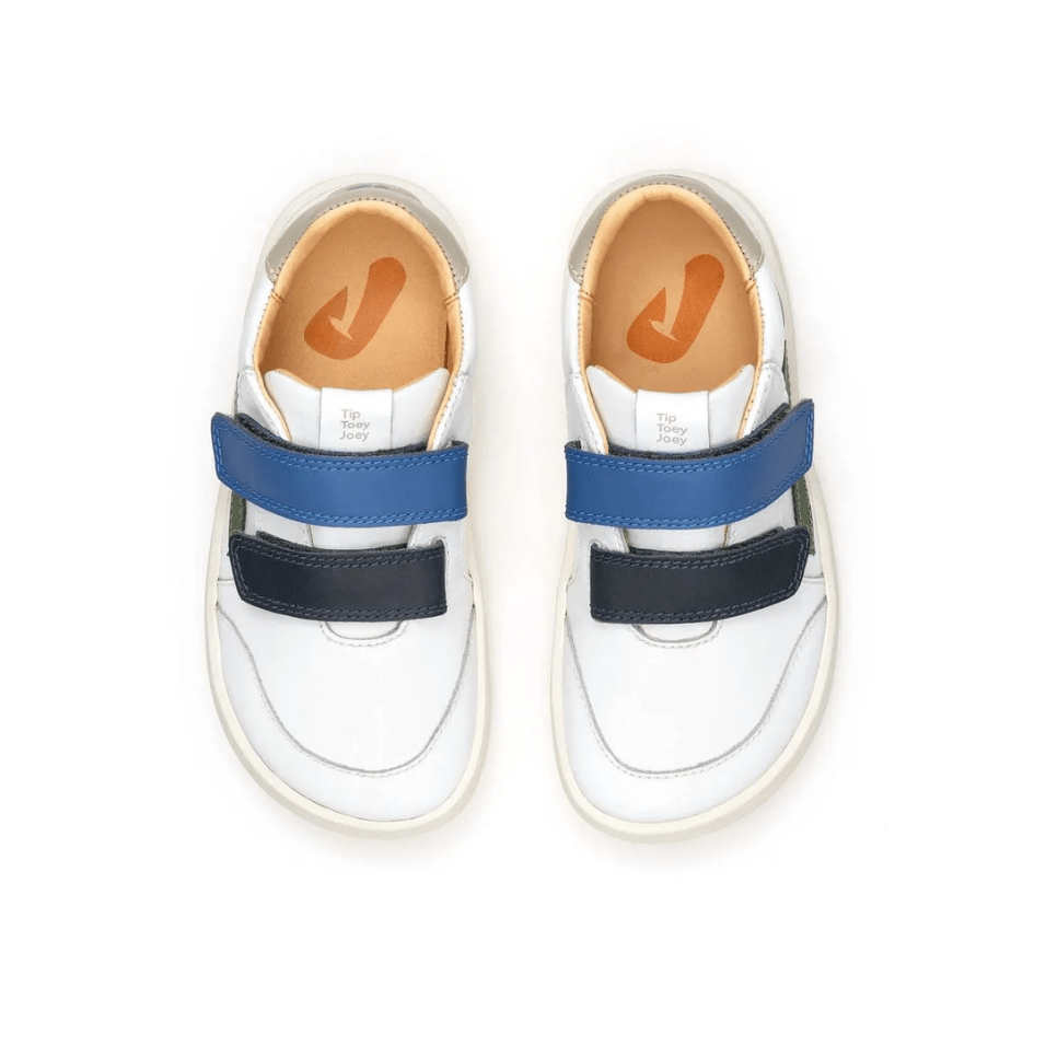 O Tênis Couro Landy White Navy Blue Tip Toey Joey foi desenvolvido para respeitar o crescimento natural dos pezinhos, oferecendo liberdade, segurança e máximo conforto no dia a dia.