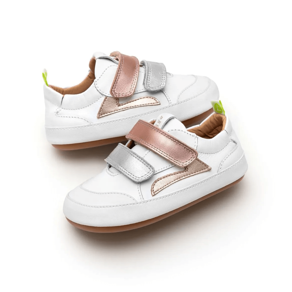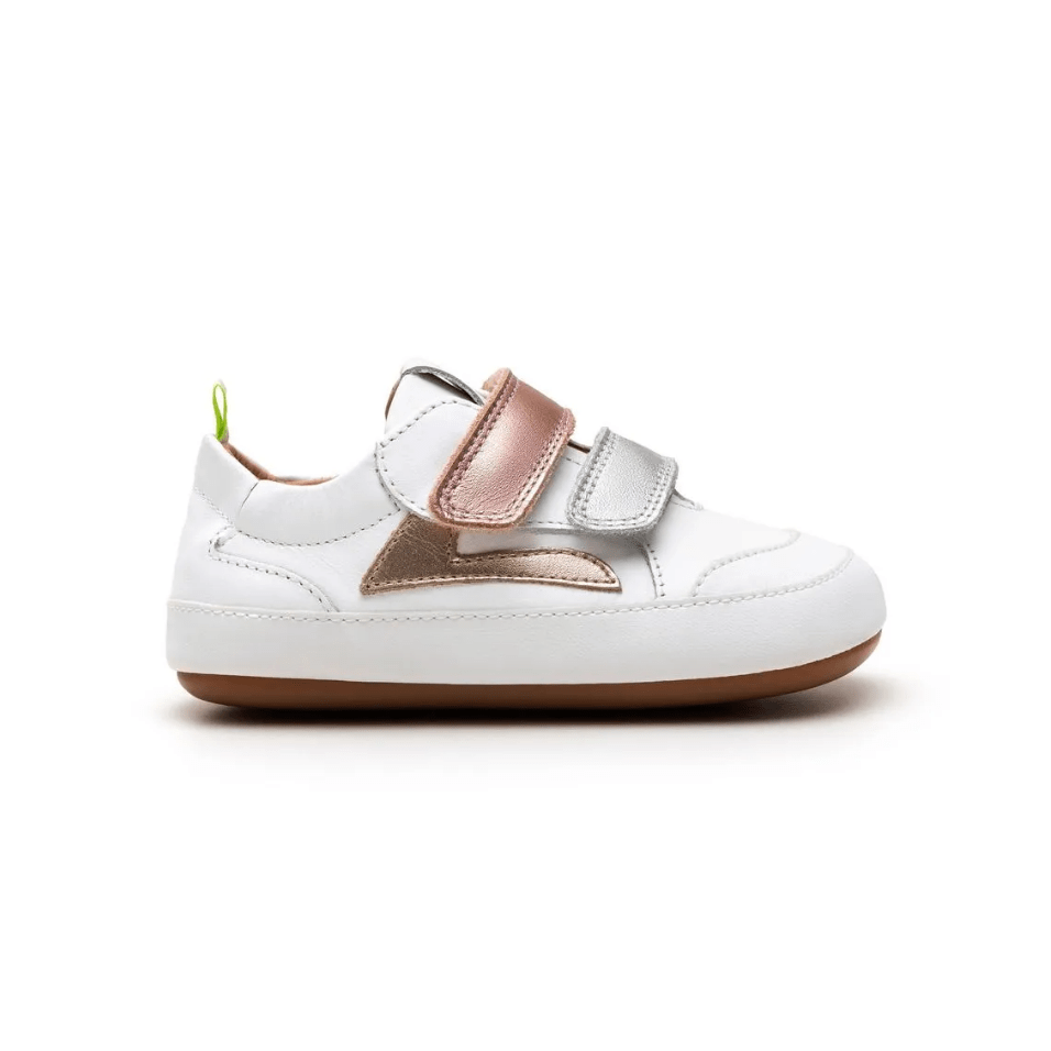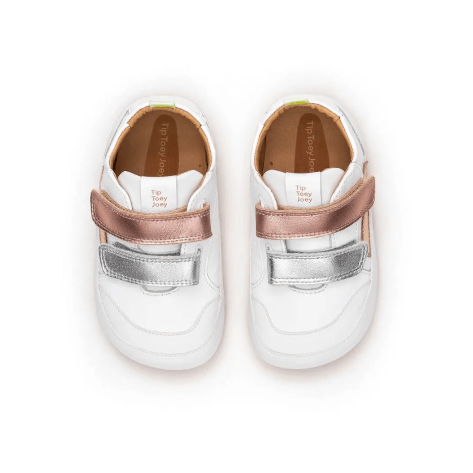 O Tênis Couro Landy White Rose Gold Tip Toey Joey combina design minimalista em branco com detalhes metalizados em rose gold e prata, criando um visual delicado e super atual.