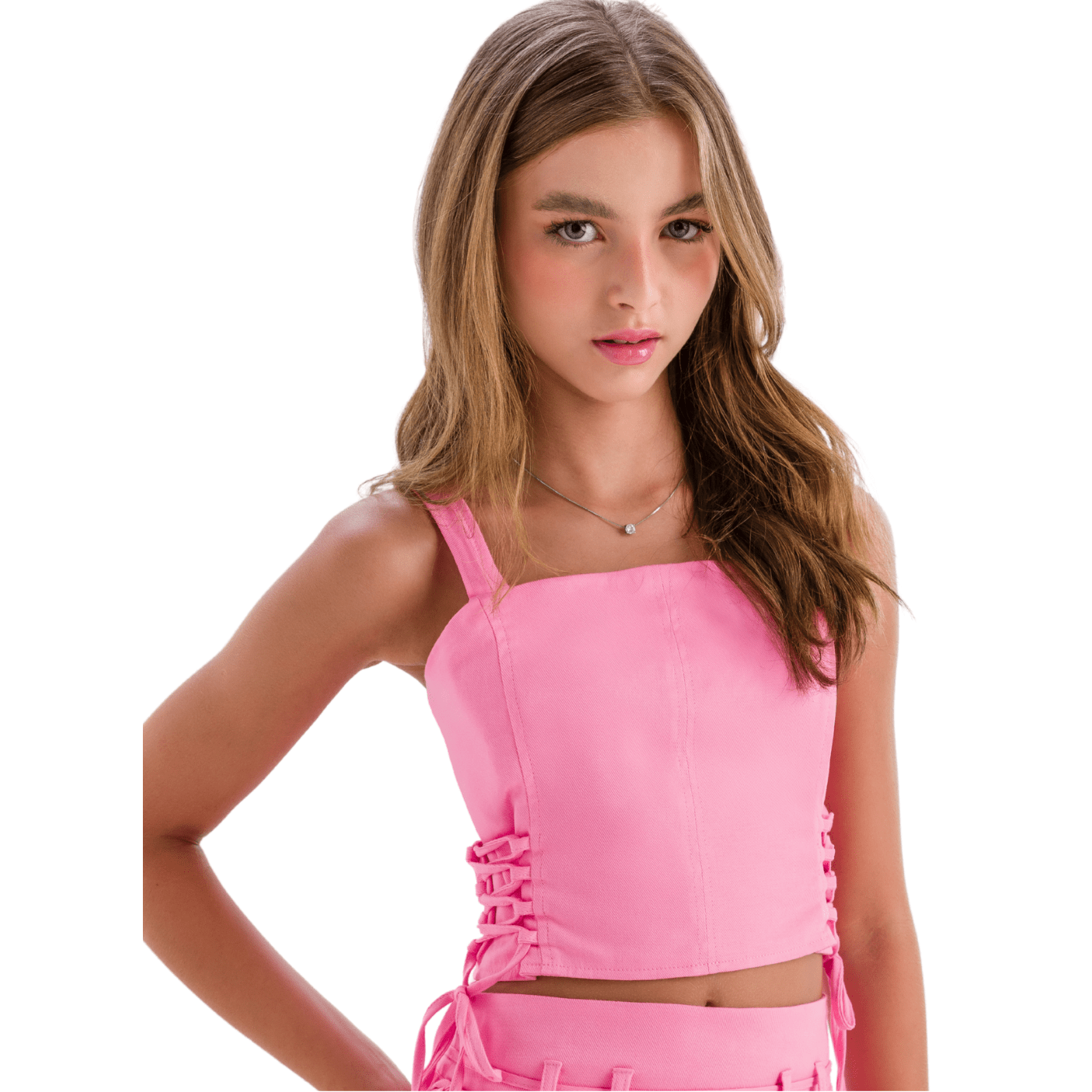 A cor rosa chiclete é tendência e transmite jovialidade, alegria e feminilidade, criando uma presença marcante em qualquer produção. O top combina com shorts, saias evasê, calças de cintura alta ou até sobreposições com camisas abertas, criando desde looks casuais até produções mais elaboradas para eventos e passeios.