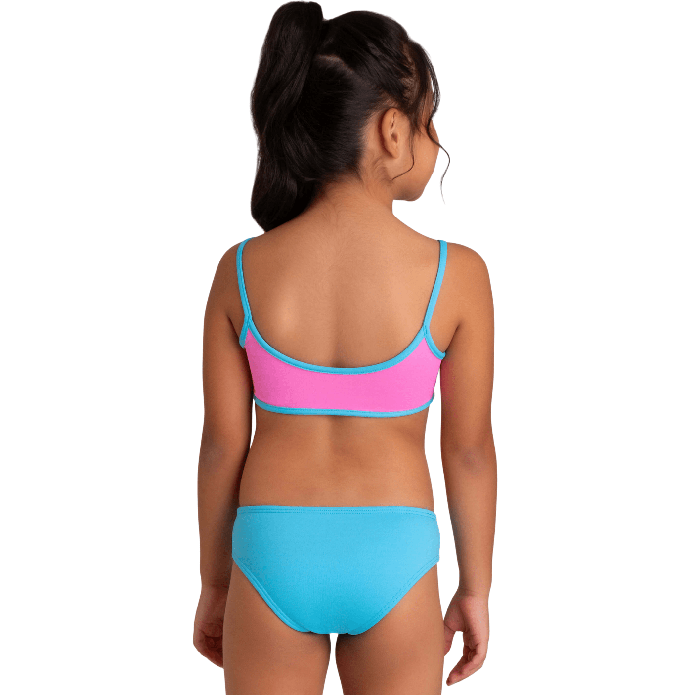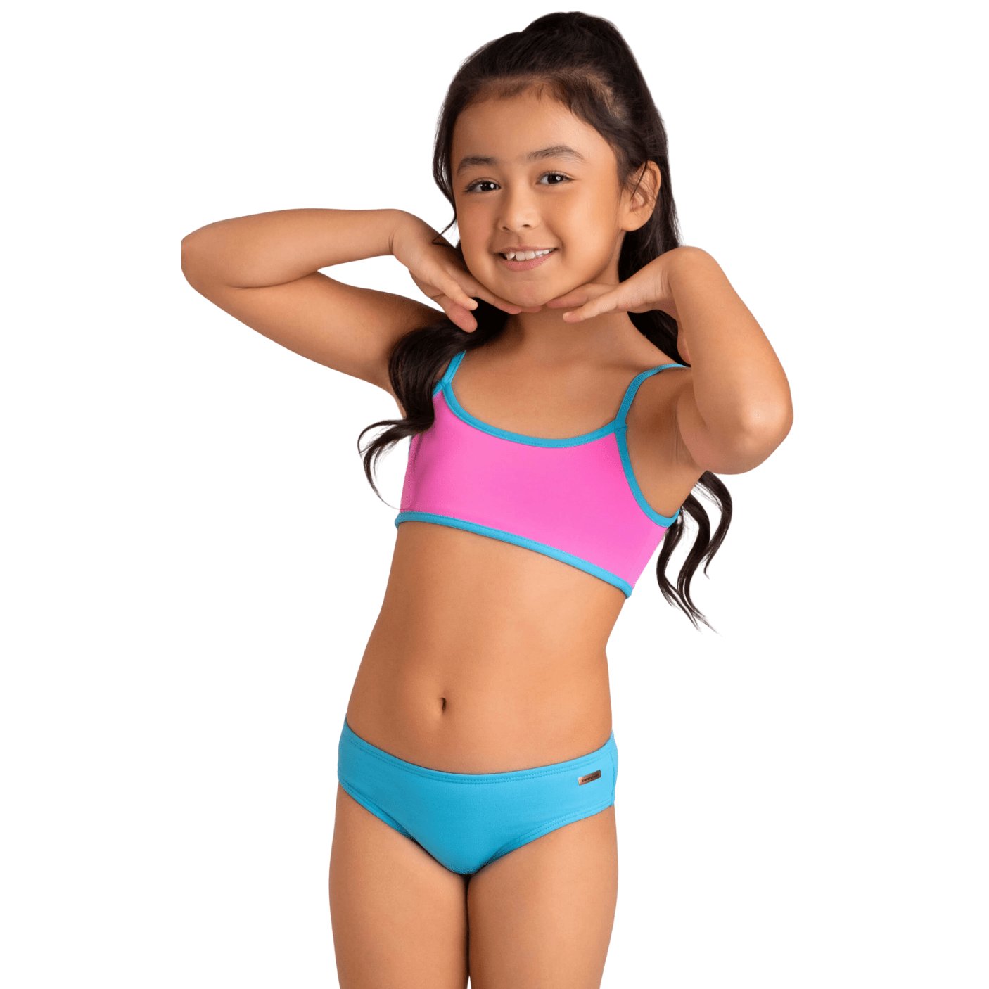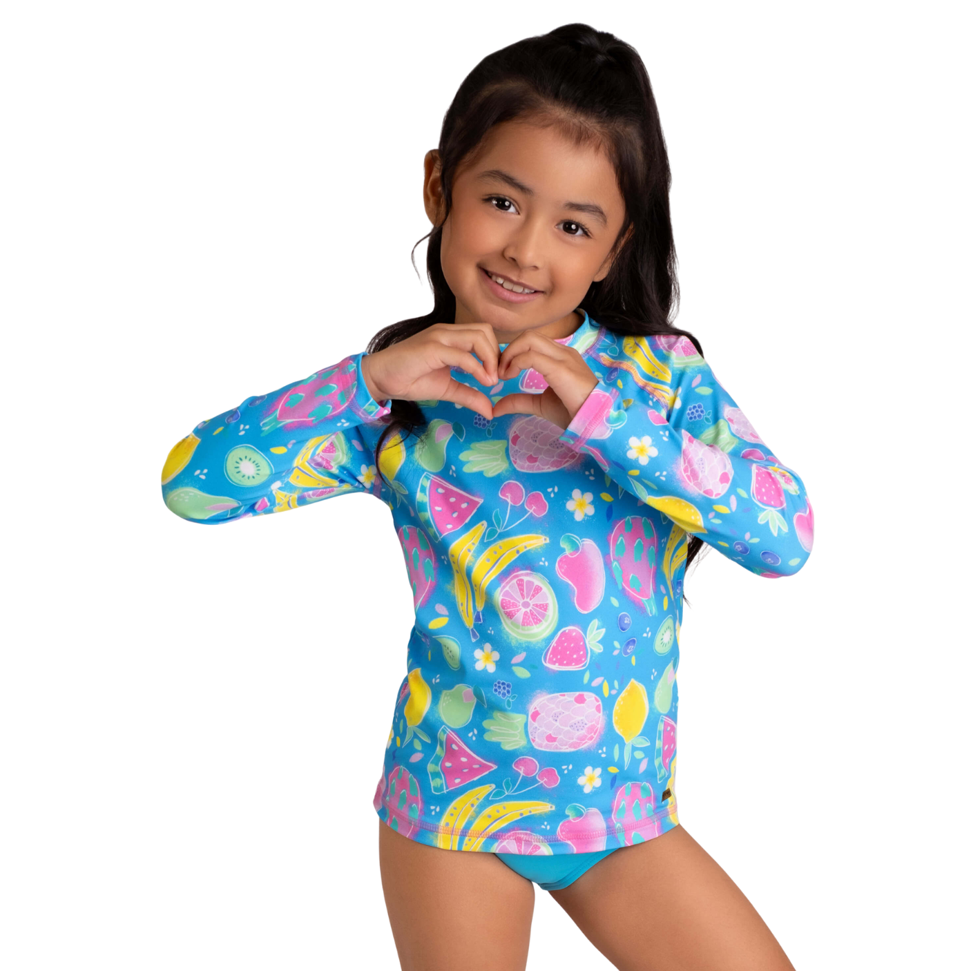 A camiseta de manga longa traz uma estampa vibrante e alegre com frutas tropicais coloridas, além de proteger a pele dos raios solares. O biquíni de duas peças, em tons de azul e pink, tem modelagem confortável e elástico macio que se ajusta perfeitamente ao corpo, proporcionando máximo conforto durante as brincadeiras.