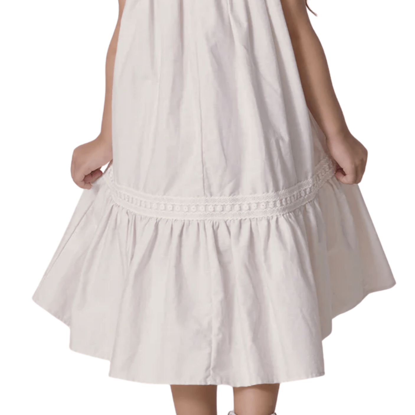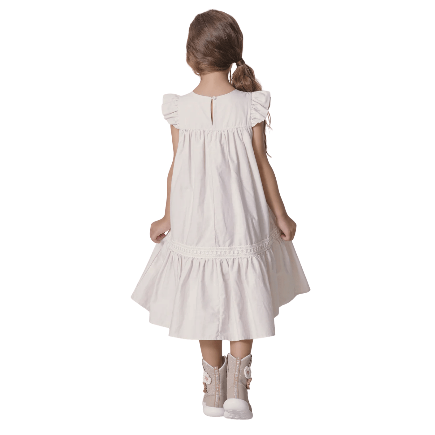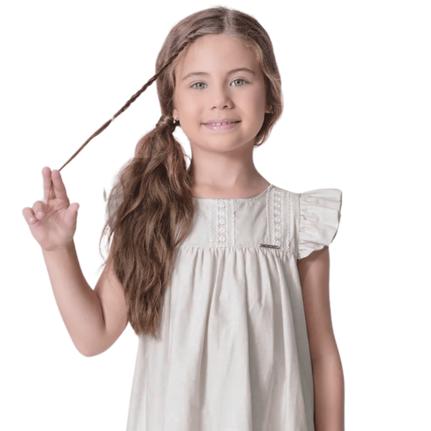 Com modelagem soltinha e fluida, o vestido oferece liberdade de movimentos, sendo perfeito para acompanhar a energia das crianças sem perder a elegância. A cor bege areia reforça sua versatilidade, permitindo combinações com diferentes calçados e acessórios, do casual ao mais arrumado.