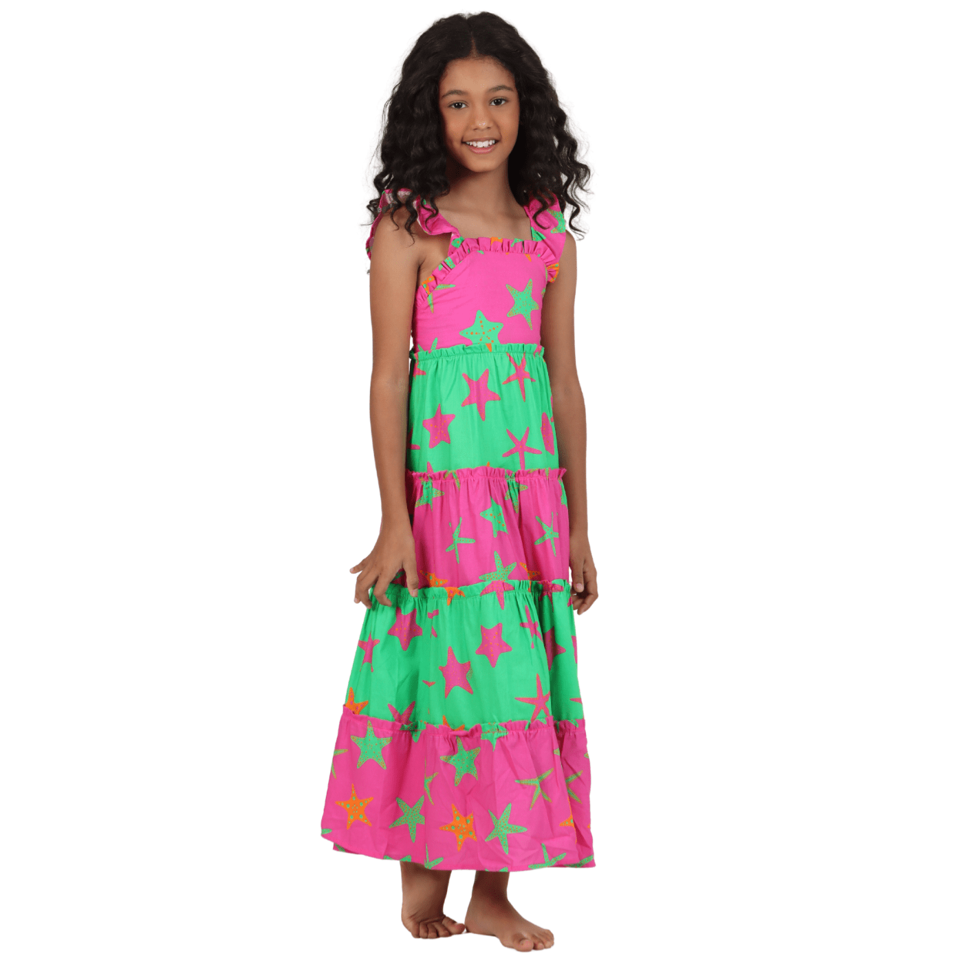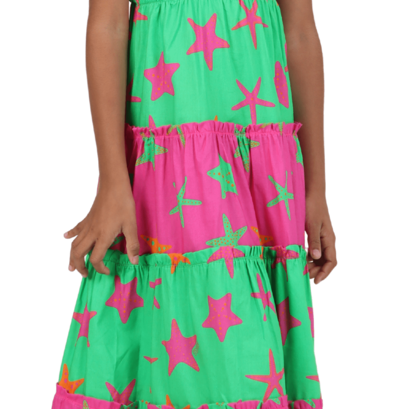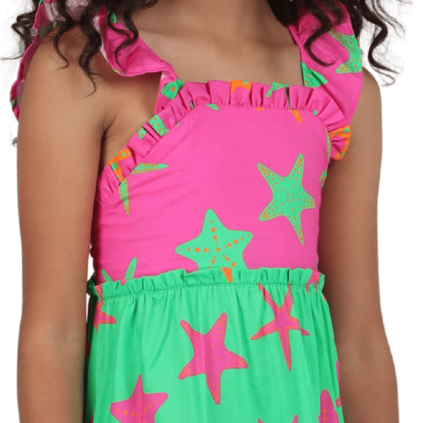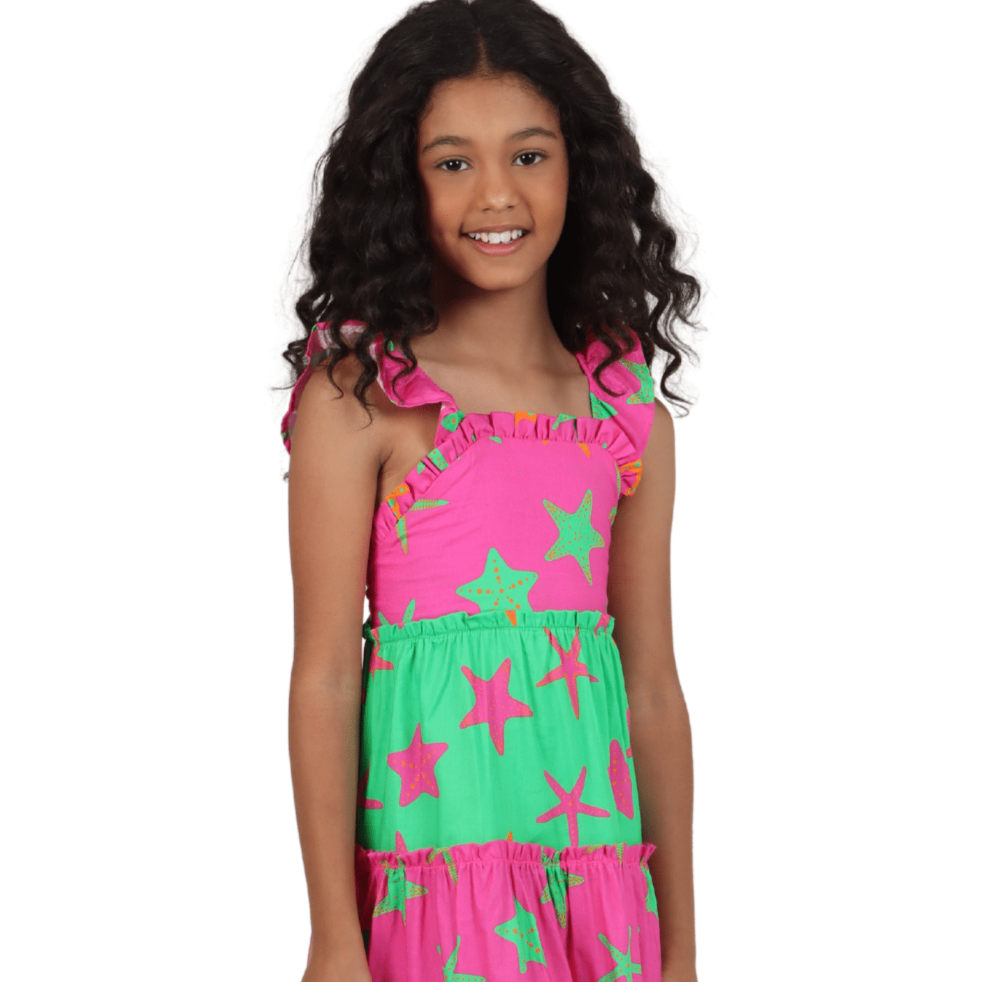 O design encantador é marcado pela combinação vibrante das cores rosa e verde, que se destacam em uma padronagem exclusiva de estrelinhas divertidas. As alças com delicados babadinhos adicionam feminilidade e graça, enquanto a saia com caimento fluido cria um movimento suave, deixando o visual ainda mais alegre e descontraído.