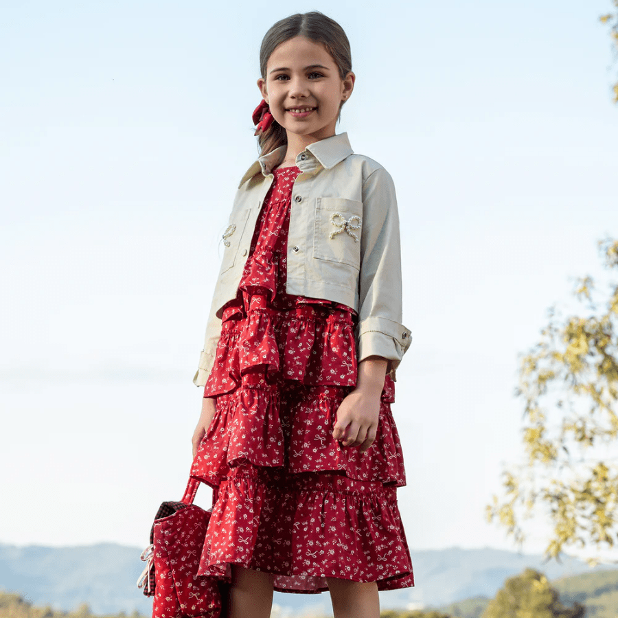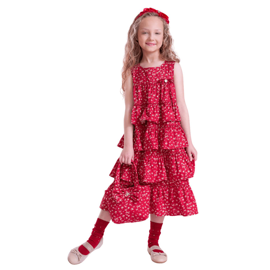 O vestido infantil floral vermelho Pituchinhus é perfeito para quem ama looks clássicos com toque moderno. A combinação da estampa delicada com os babados em camadas cria um visual encantador, cheio de personalidade e feminilidade.