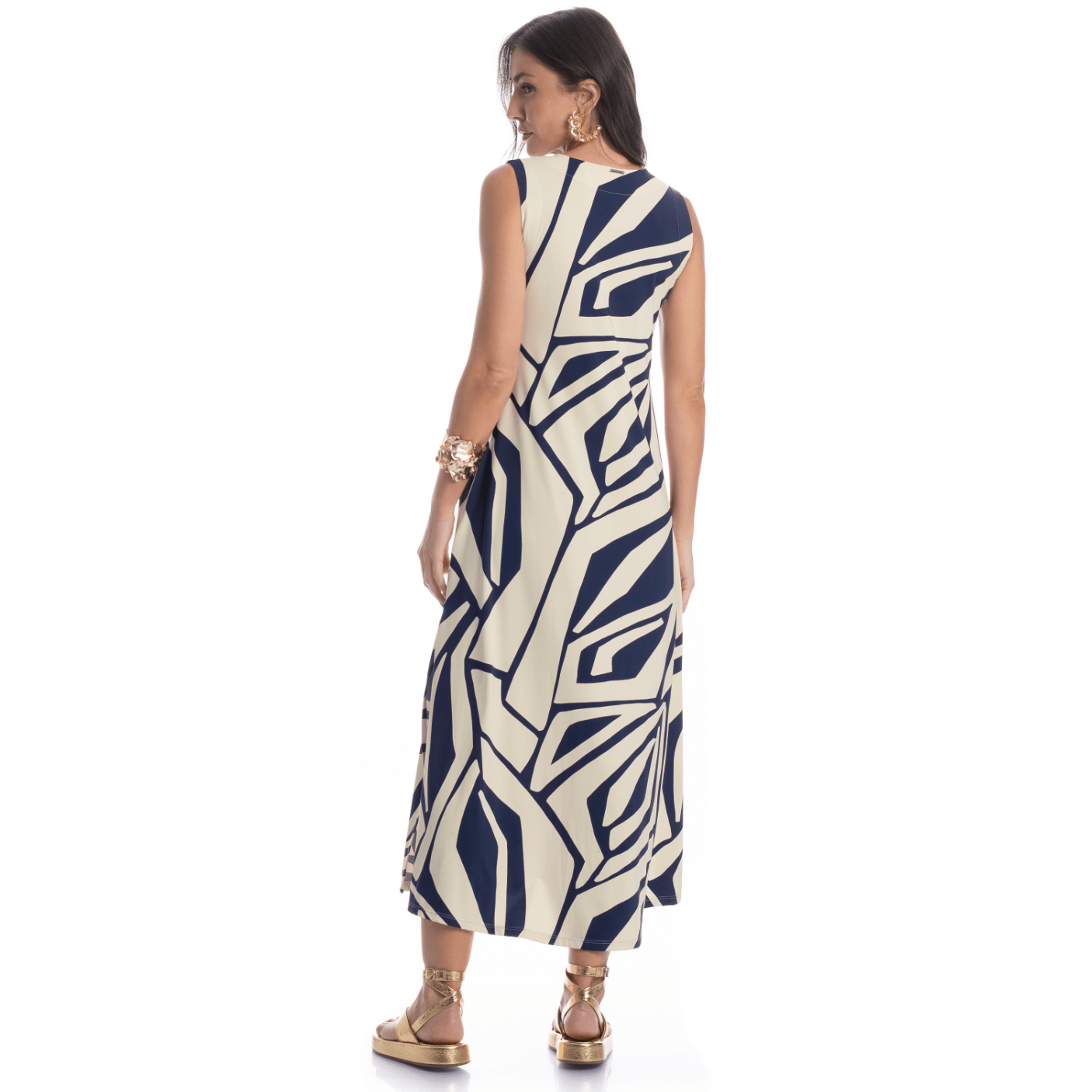 A estampa geométrica exclusiva em tons de off white e azul marinho traz modernidade e destaque ao visual. O decote em V alonga o colo, enquanto as fendas laterais proporcionam movimento e um toque de sensualidade na medida certa. Para completar, o modelo conta com bolsos laterais funcionais, garantindo praticidade sem perder o charme.