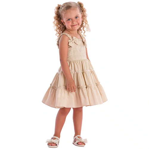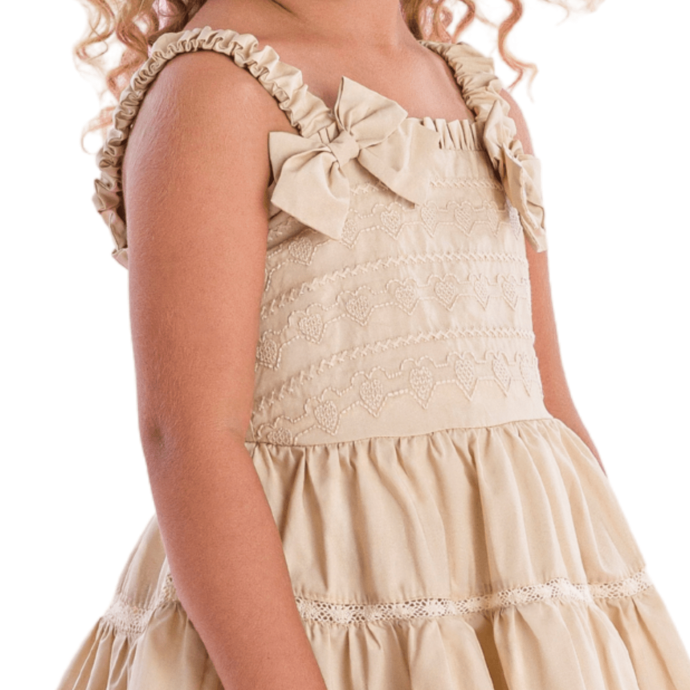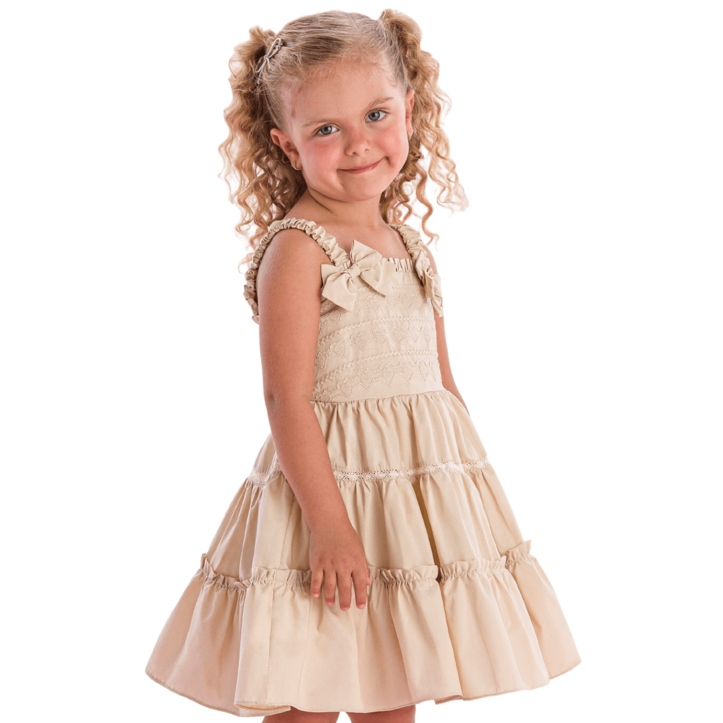 As alcinhas frufru com babadinhos e o laço delicado aplicado na frente acrescentam um toque encantador, enquanto a modelagem com camadas franzidas na saia cria movimento e fluidez, proporcionando um caimento impecável. A cor bege, neutra e elegante, é extremamente versátil e permite composições clássicas para diferentes ocasiões.