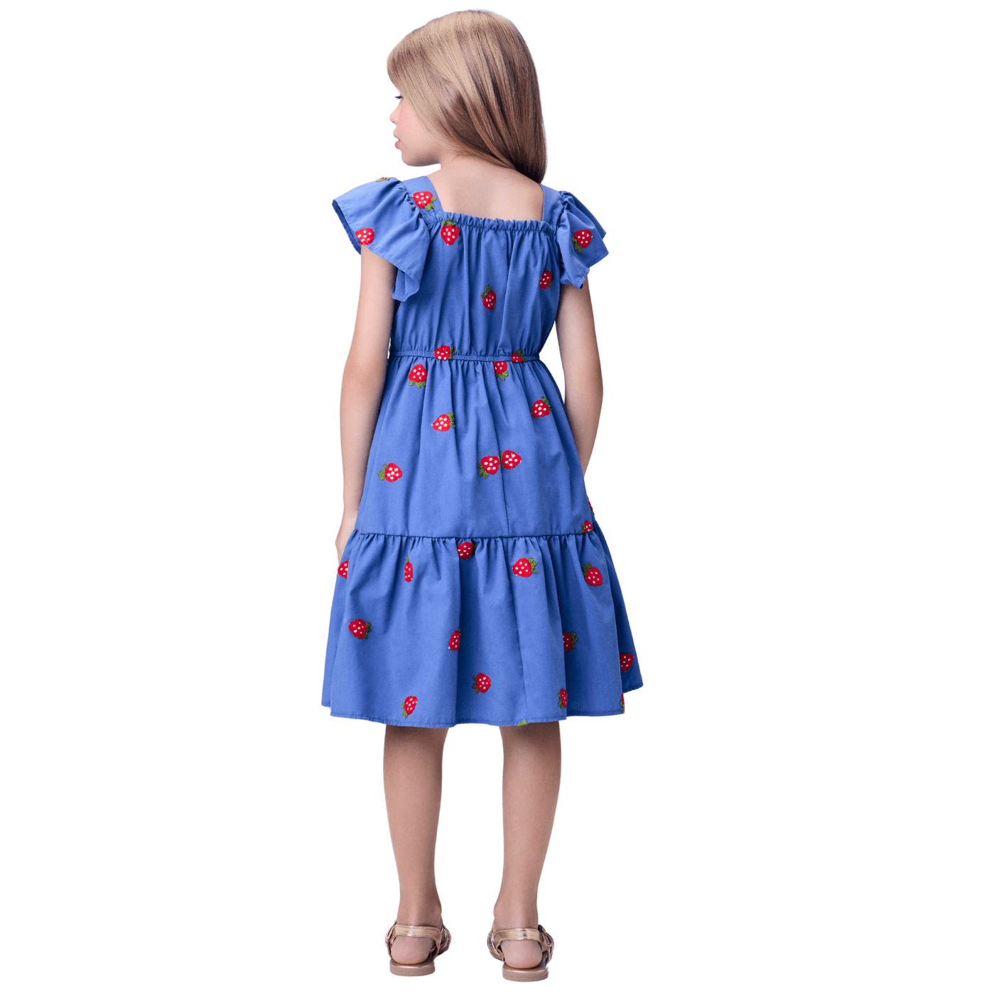 Vestido Bordado Morangos Azul Denim Momi – Doce, Alegre e Cheio de Charme