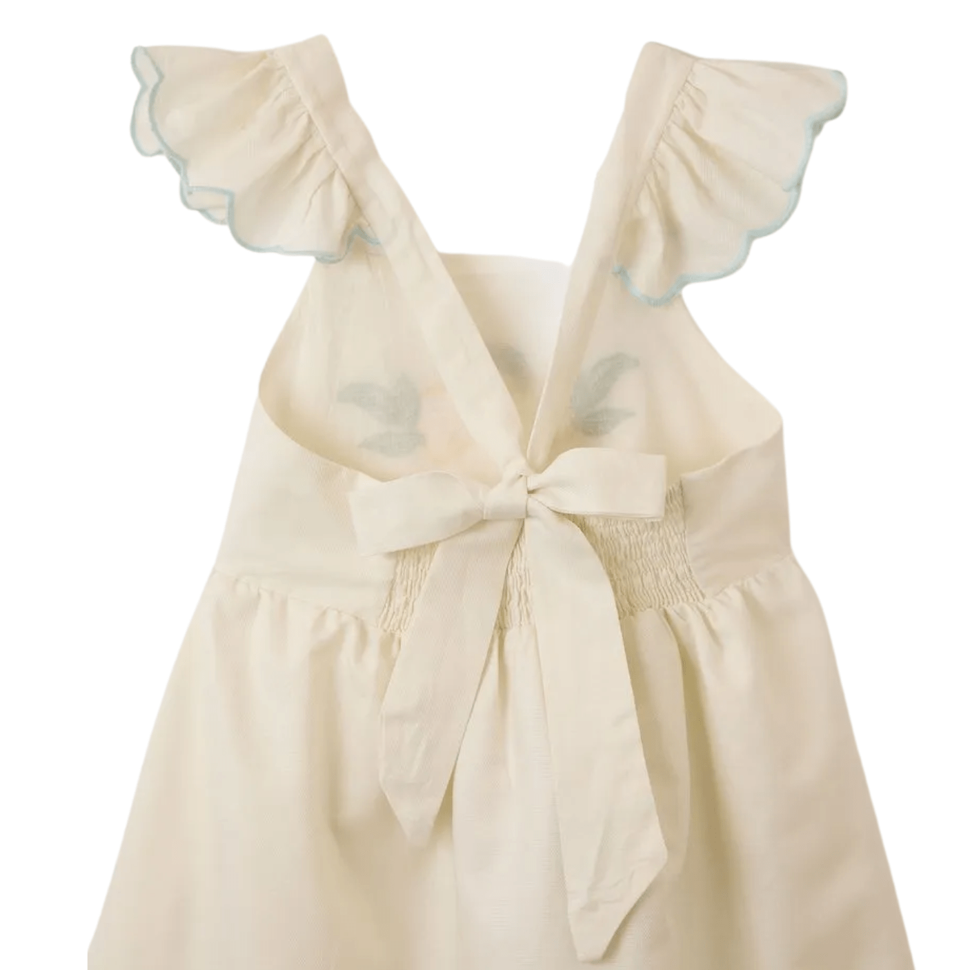 Confeccionado em tecido leve de algodão, o modelo apresenta alças com babadinhos, recorte na cintura e barra com acabamento ondulado, que adicionam um toque artesanal e romântico à peça. A base off-white valoriza os bordados coloridos e dá ao look uma estética suave, leve e encantadora — perfeita para ocasiões especiais, passeios e momentos de celebração.