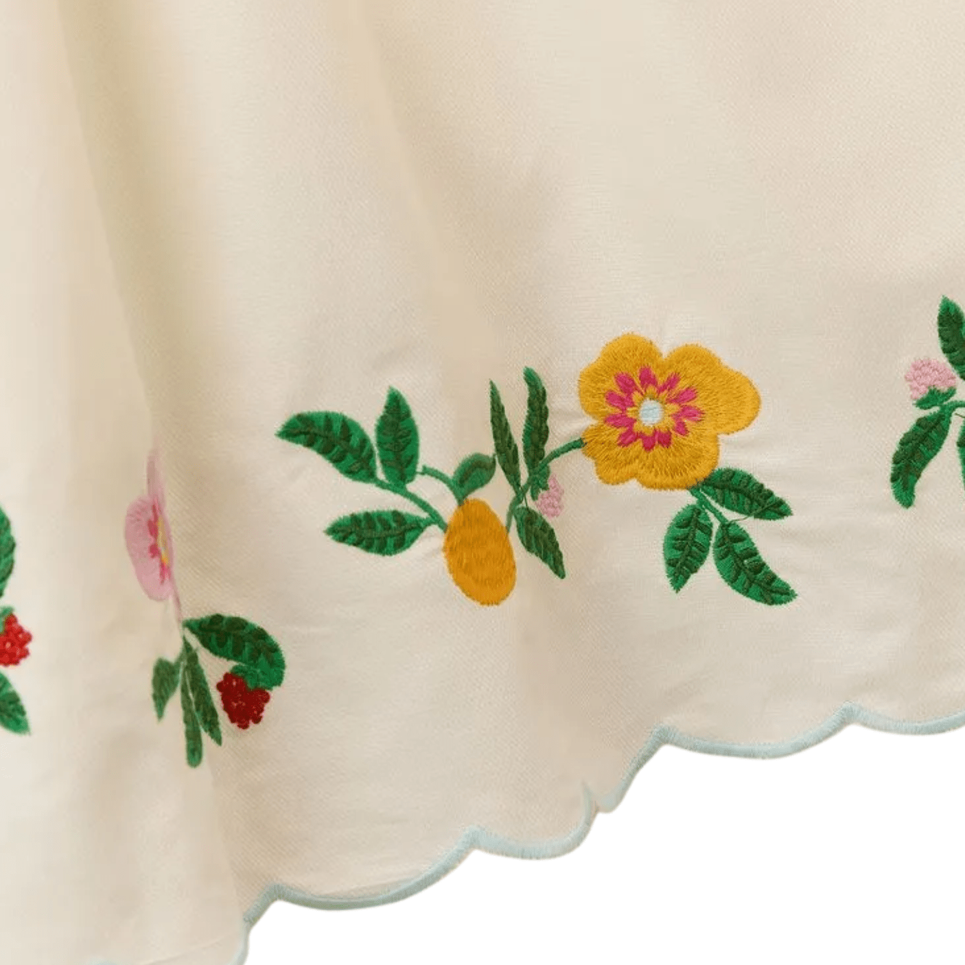 O Vestido Bordado Mucha Fruta Off Fábula é um verdadeiro encanto em forma de roupa! Inspirado na doçura e nas cores da natureza, ele traz bordados delicados de frutas e flores que remetem ao frescor e à alegria dos dias ensolarados.