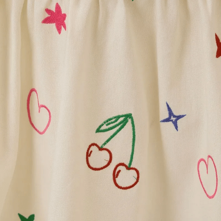 Bordados manuais de cerejas, corações, flores e estrelinhas