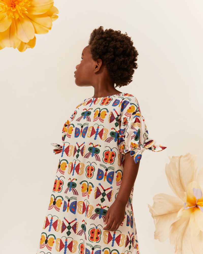 E o que torna este vestido verdadeiramente mágico é a estampa exclusiva Borbocosmo — uma composição delicada de borboletas coloridas que parecem flutuar em um céu de possibilidades. Com traços suaves e cores alegres, a estampa traduz a essência da infância: leve, sonhadora, criativa e cheia de imaginação. Cada borboleta representa liberdade e transformação, convidando as pequenas a se expressarem com autenticidade e alegria.