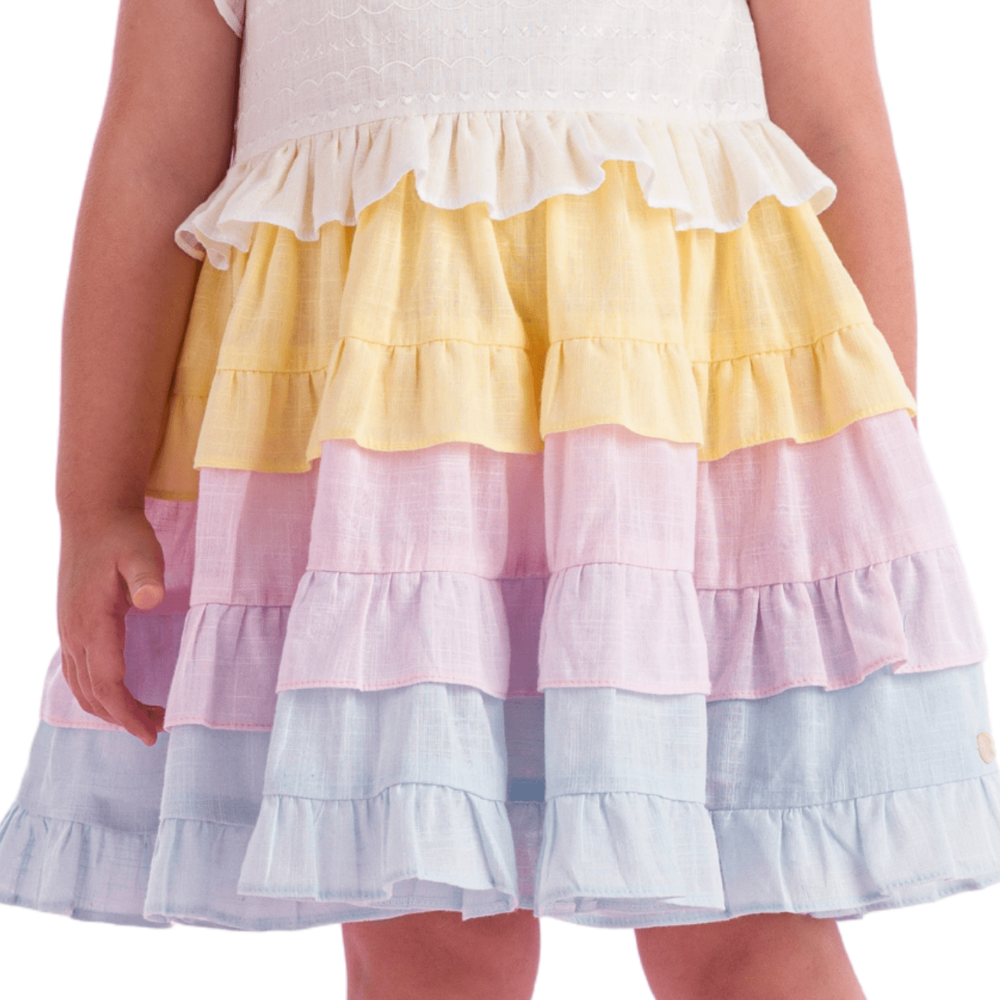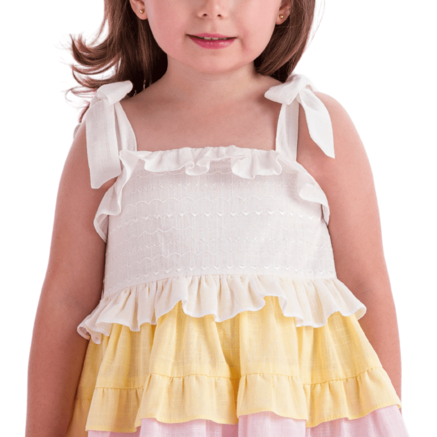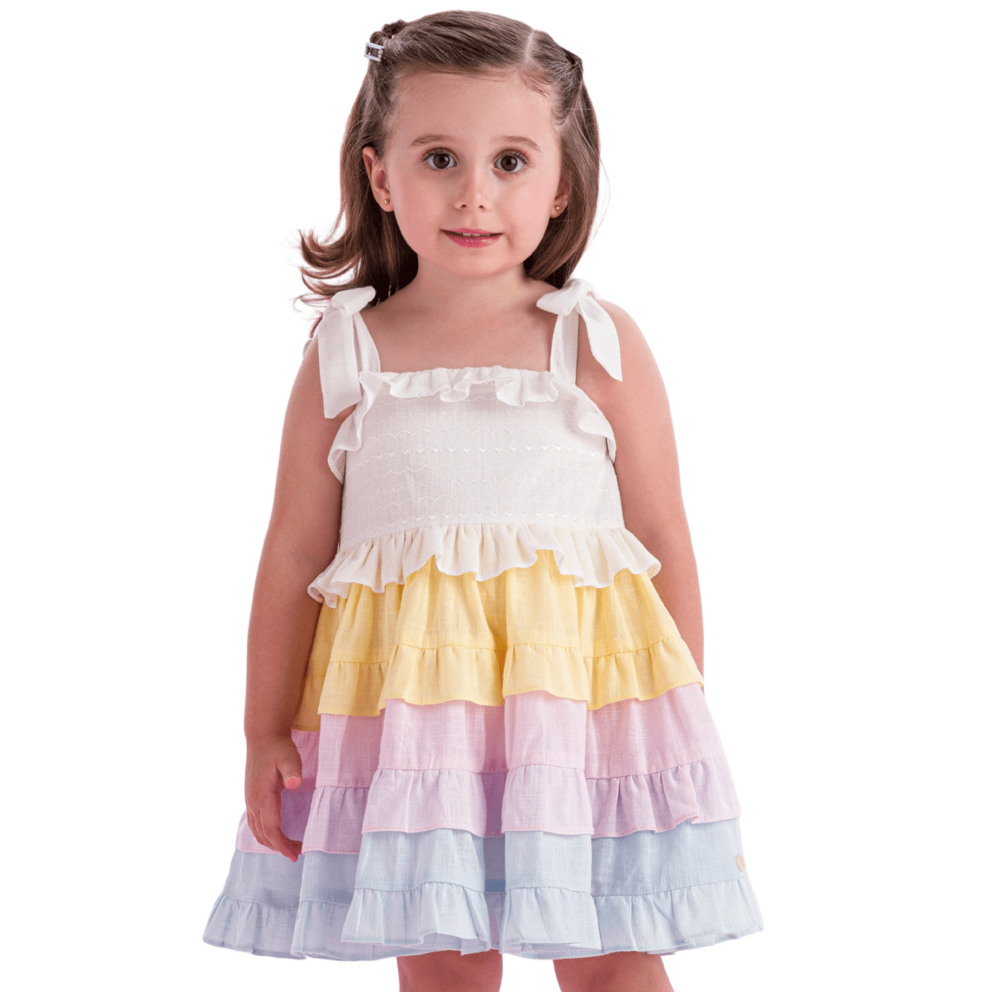 Seu design encantador traz a delicadeza da parte superior em tom branco com laços nos ombros, transmitindo romantismo e um charme extra ao look. A saia em camadas de babados multicoloridos em tons suaves e pastéis cria um efeito vibrante e gracioso, garantindo movimento fluido e um visual divertido. O detalhe franzido e os babadinhos delicados no busto adicionam ainda mais sofisticação à peça.