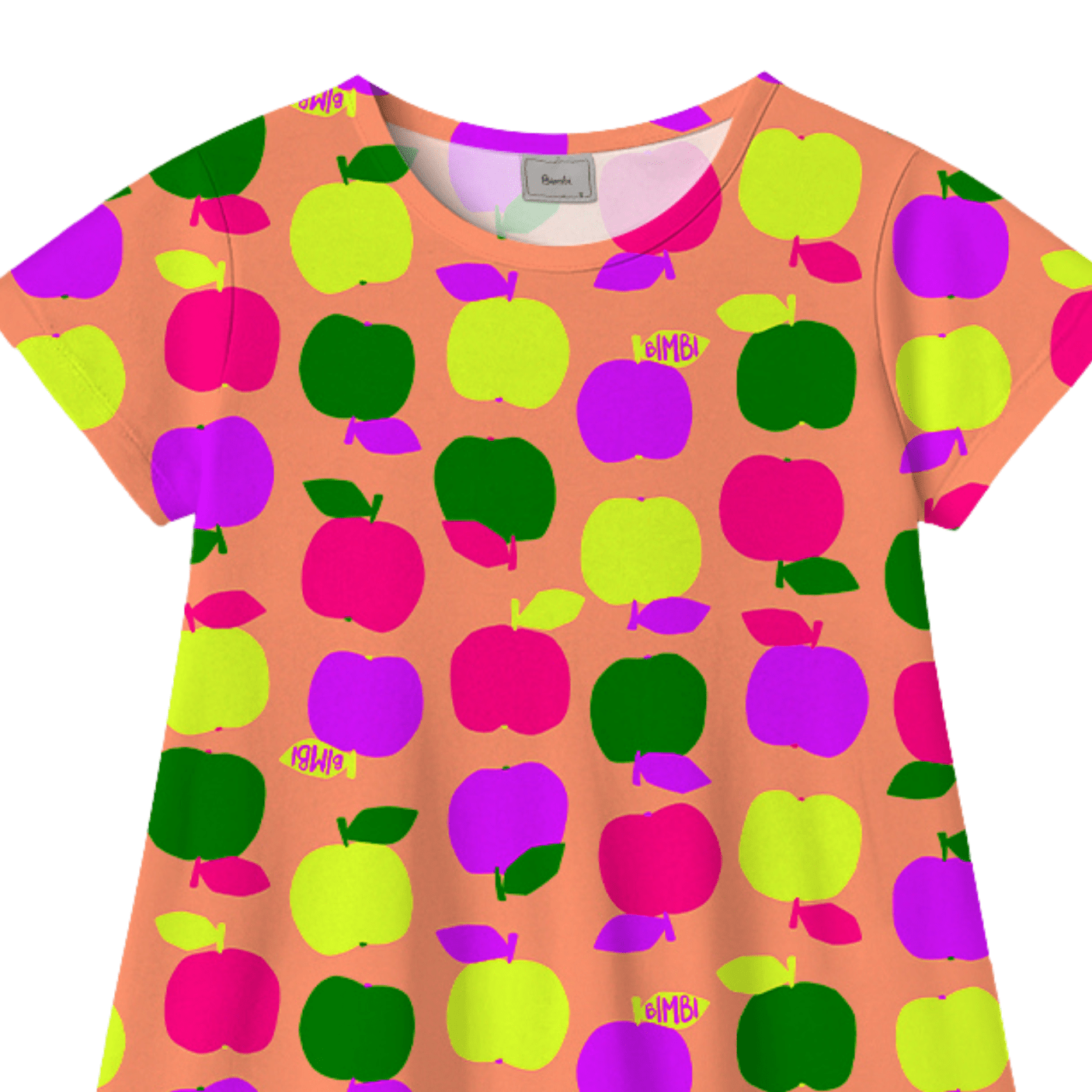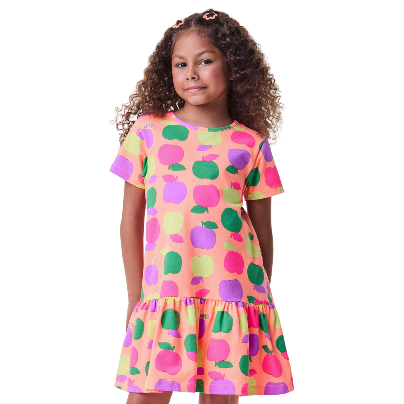 Sua estampa exclusiva de maçãs coloridas em tons vibrantes de rosa, verde, lilás e amarelo traz uma atmosfera lúdica e moderna, que encanta as crianças e garante muito estilo. A modelagem soltinha, com babado na barra, dá fluidez e um charme extra ao visual, tornando a peça prática e versátil para diversas ocasiões.