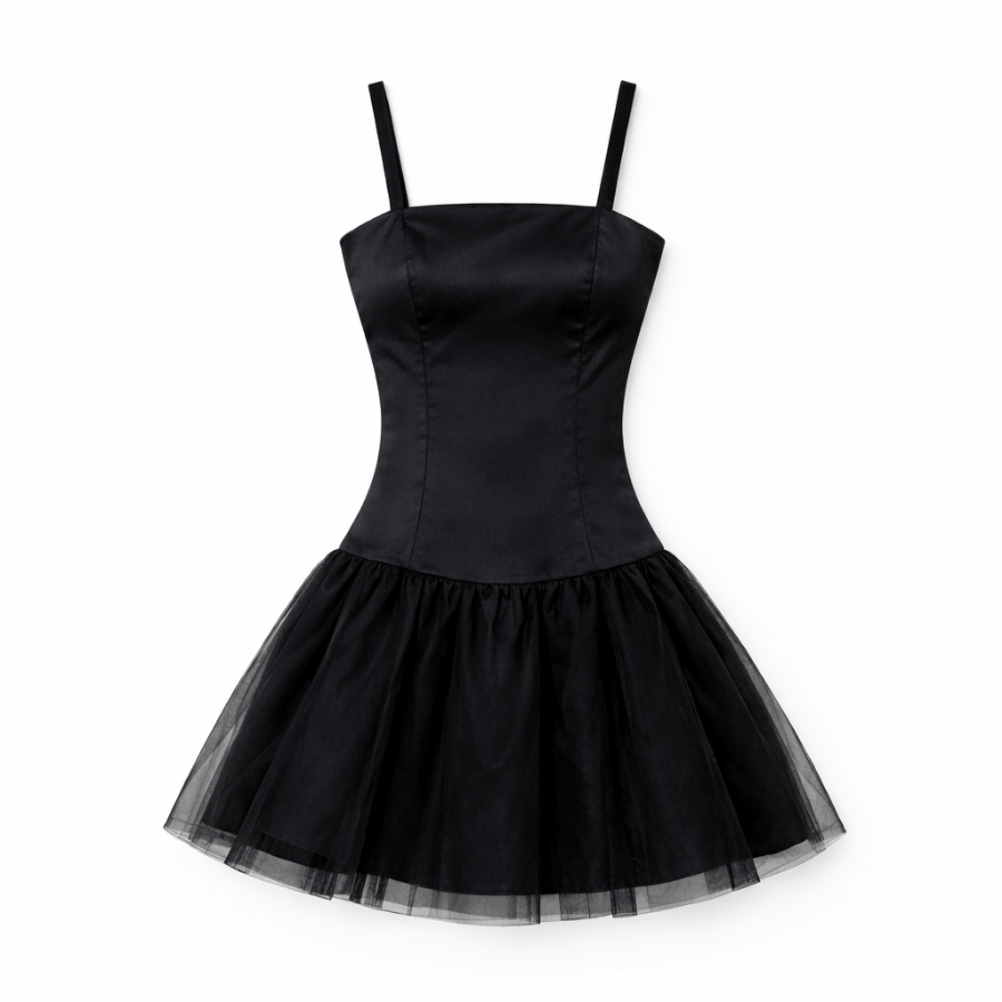 O vestido preto com saia de tule Vanilla é um clássico reinventado. A combinação de estrutura + leveza cria um visual equilibrado, feminino e cheio de personalidade.
