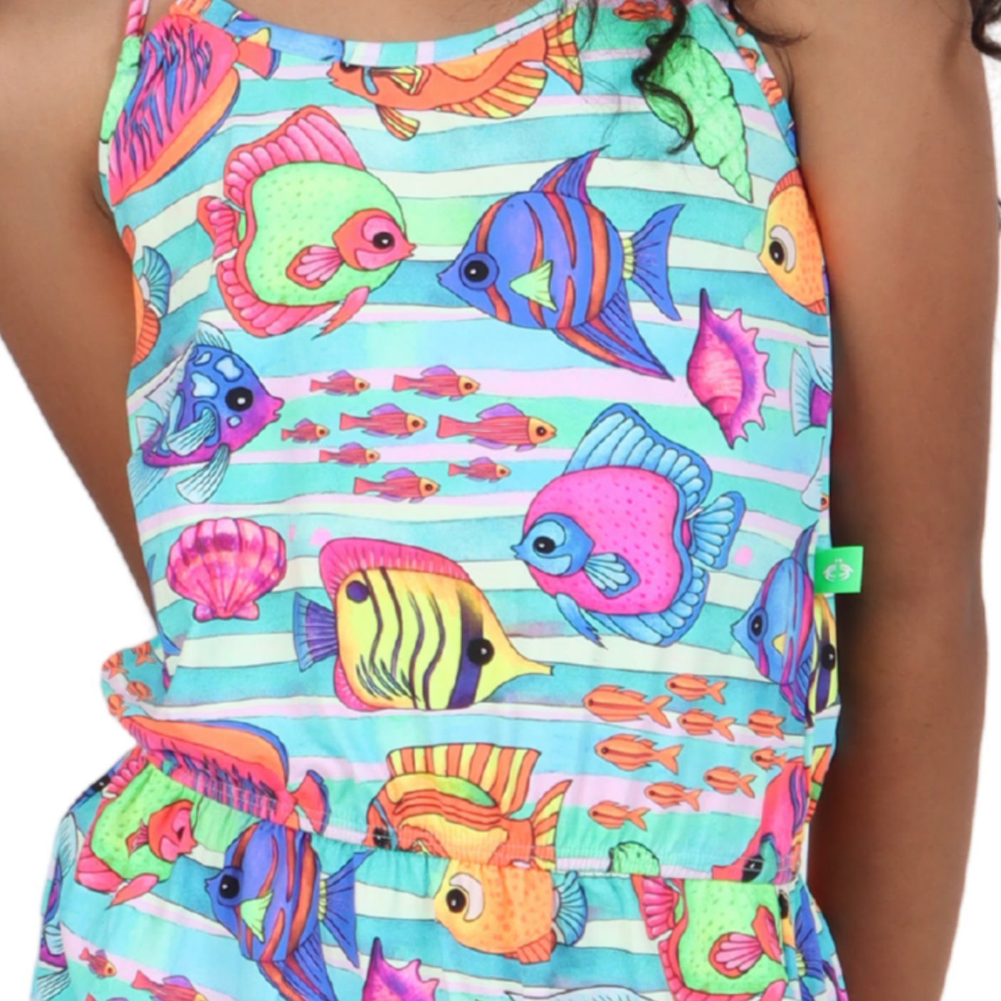 Com modelagem soltinha e caimento fluido, o vestido apresenta decote halter com alcinhas finas e ajuste delicado na cintura, que valoriza o visual com muito charme. O destaque fica por conta da estampa aquarela de peixinhos e elementos do fundo do mar em cores vibrantes, que traduzem leveza, diversão e um toque tropical encantador.