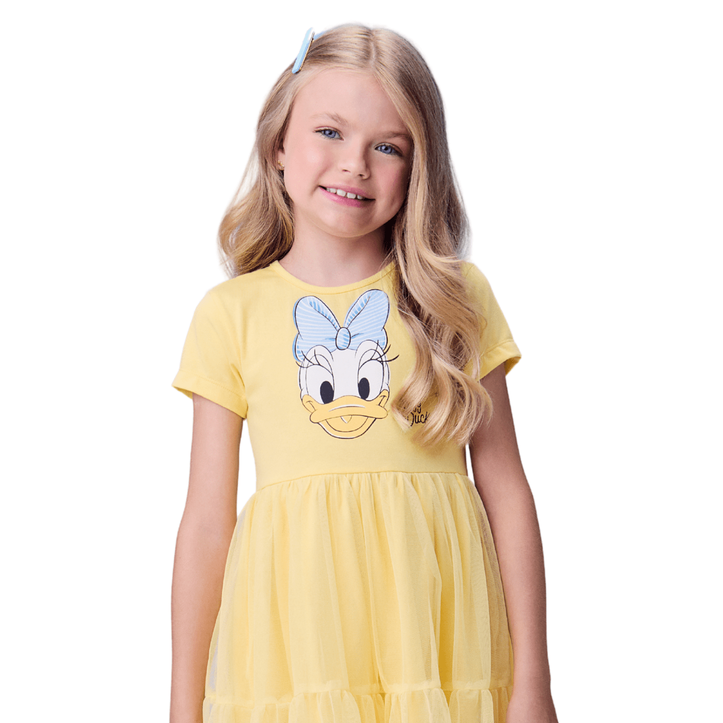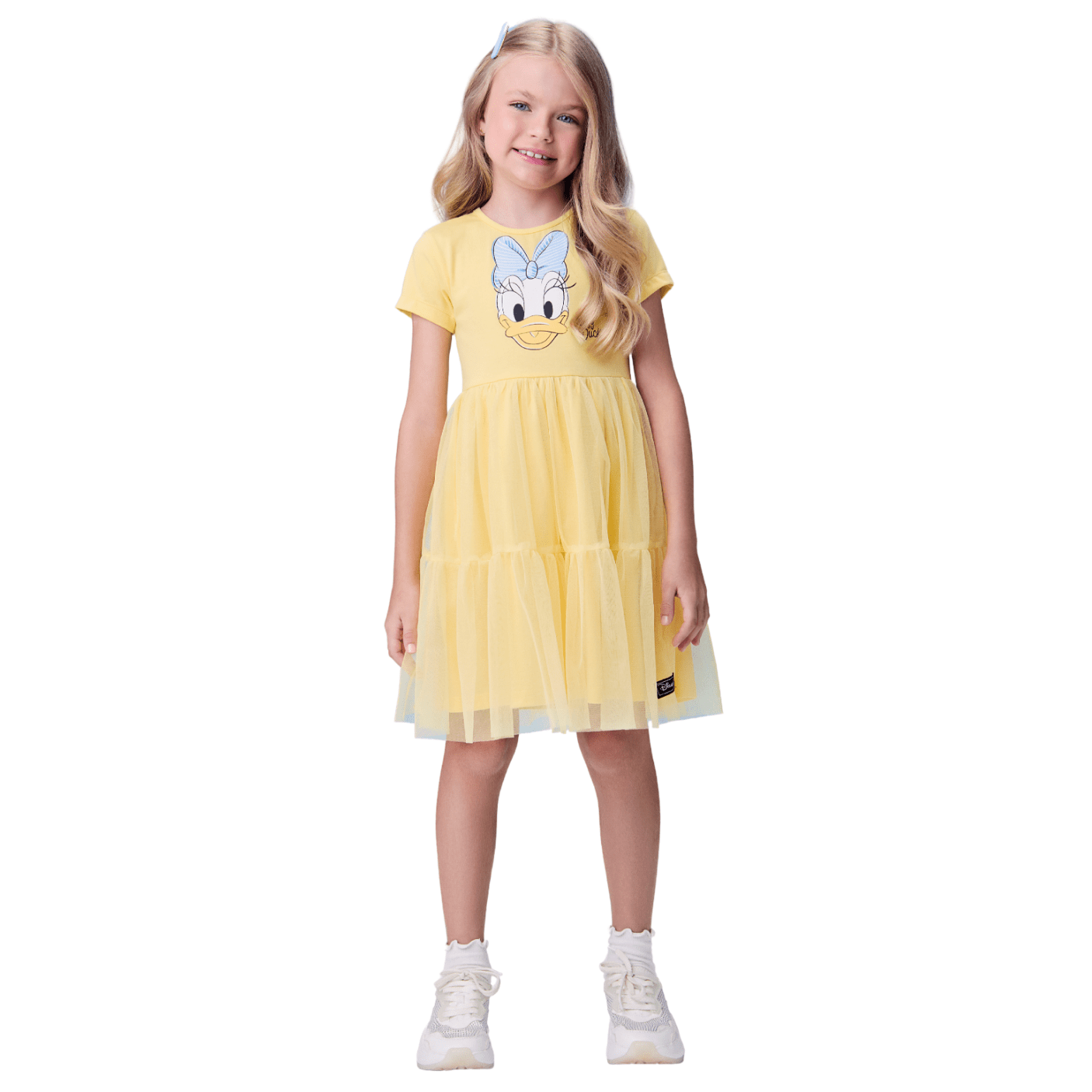 Com seu amarelo vibrante, o vestido transmite a energia do verão e o espírito divertido da infância. A estampa centralizada da Daisy com aplicação de brilho sutil adiciona um toque fashion que as meninas vão amar!