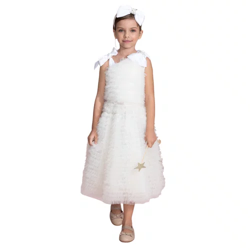 Confeccionado em tule frufru em camadas delicadas, o vestido cria volume leve, toque macio e um visual etéreo. Sua textura única, com aplicação minuciosa das camadas, confere movimento, leveza e um ar mágico a cada passo. O off white clássico é sofisticado e atemporal, permitindo combinações com acessórios metalizados, perolados ou coloridos sem perder a elegância da proposta.