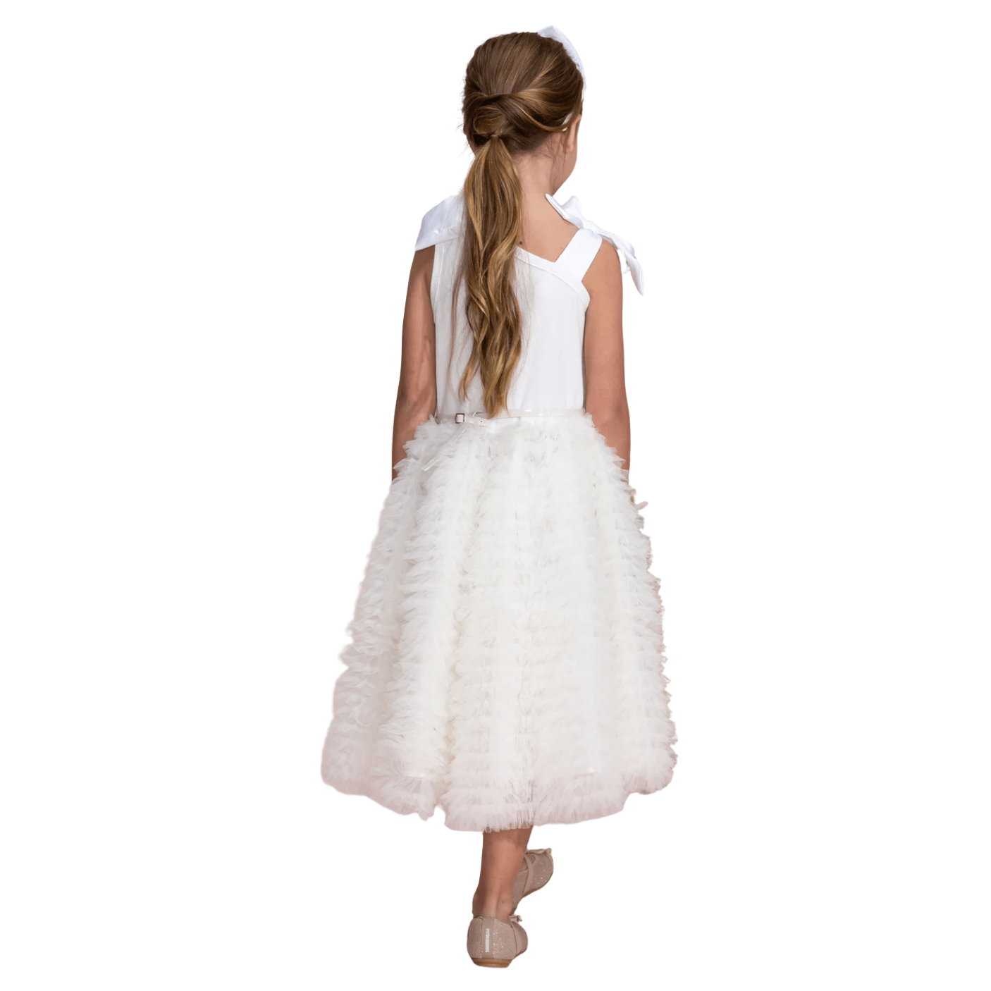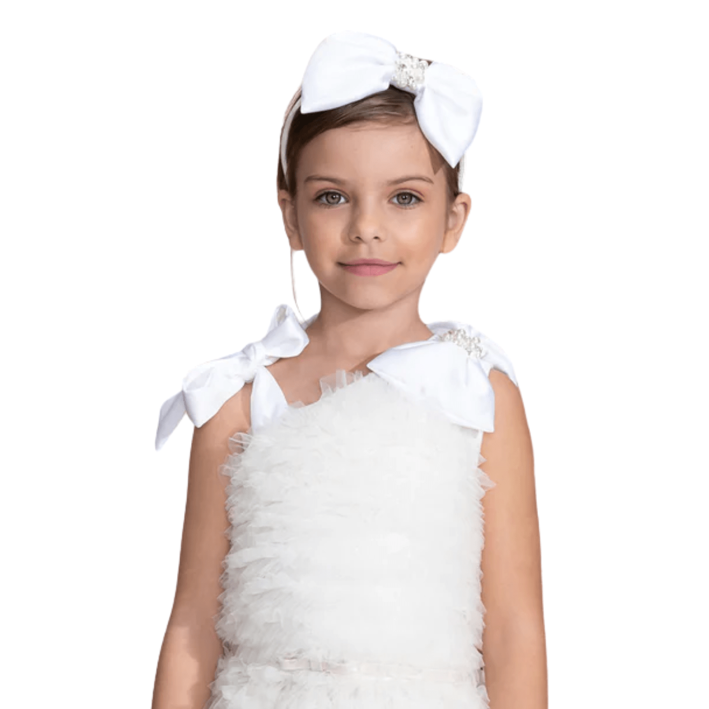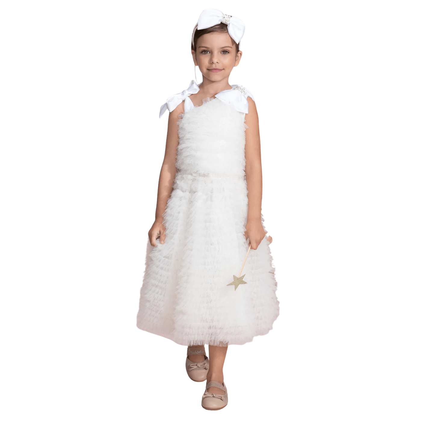 Os laços nos ombros trazem romantismo e o charme característico da Pituchinhus, enquanto a cintura marcada garante uma silhueta impecável e delicada. O acabamento superior, a qualidade do tule e o caimento perfeito revelam todo cuidado da marca em produzir peças premium e memoráveis.
