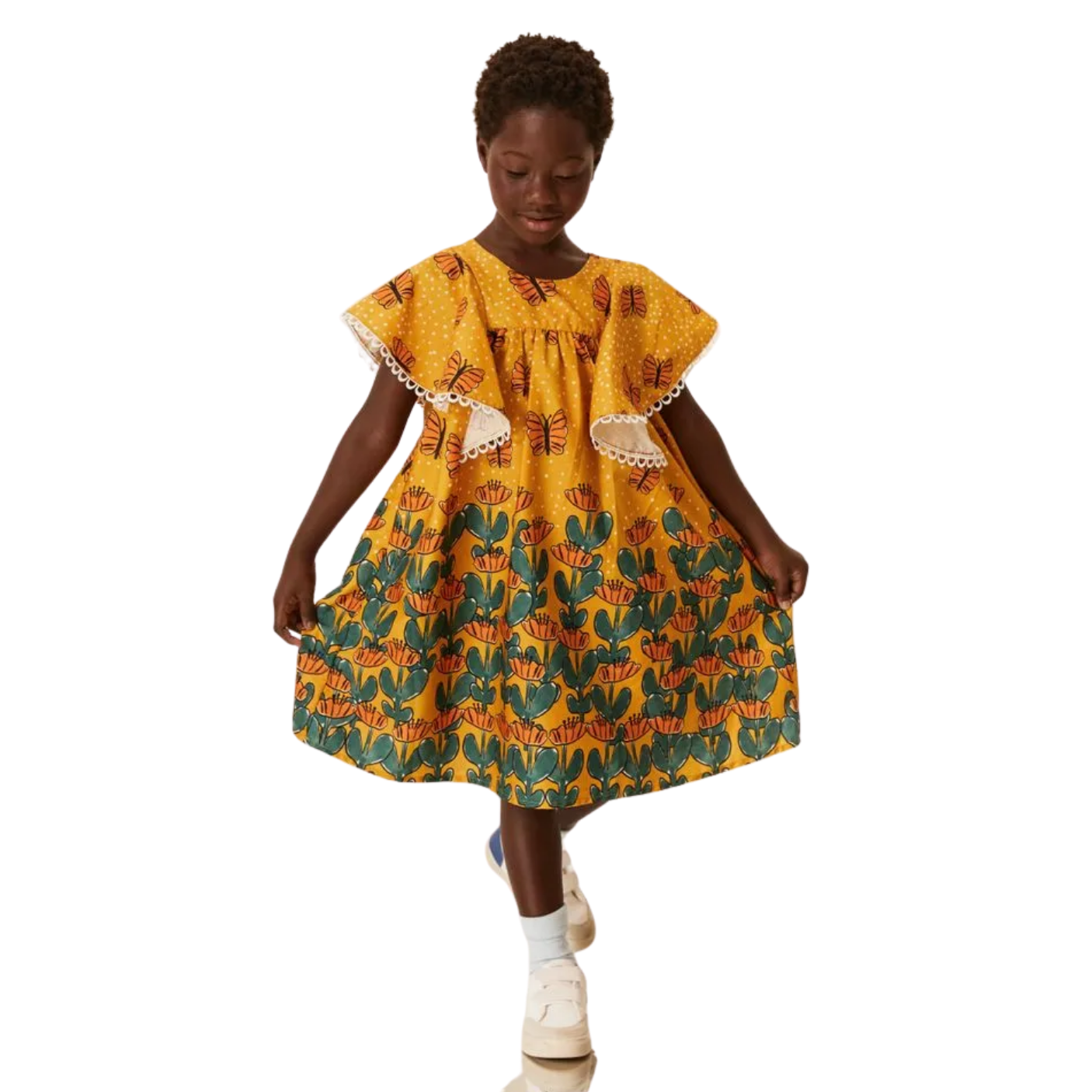 O grande destaque fica por conta da estampa Jardim Borboletas, que traz borboletas e elementos florais em um desenho delicado, cheio de vida e poesia. Essa composição visual remete aos momentos de leveza e liberdade da infância, despertando a imaginação das pequenas e tornando cada uso uma nova aventura no mundo encantado da natureza.