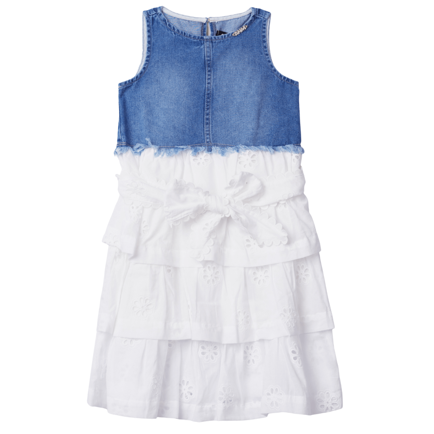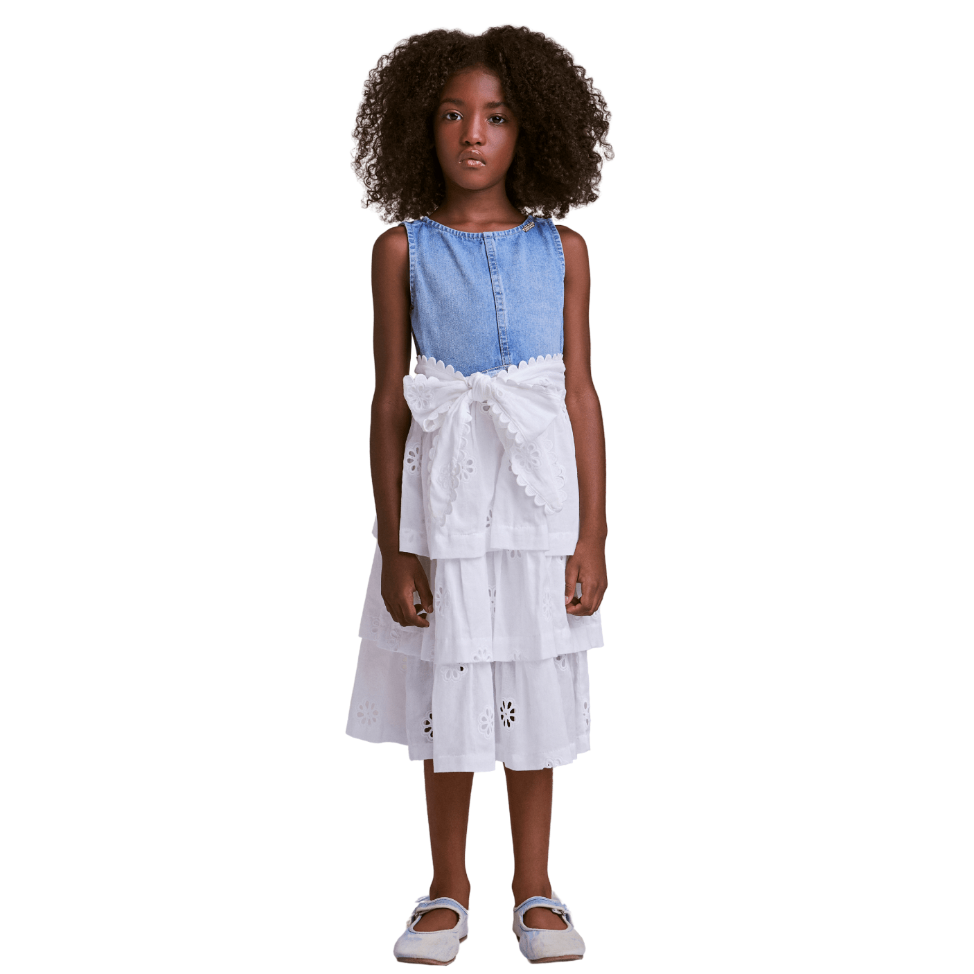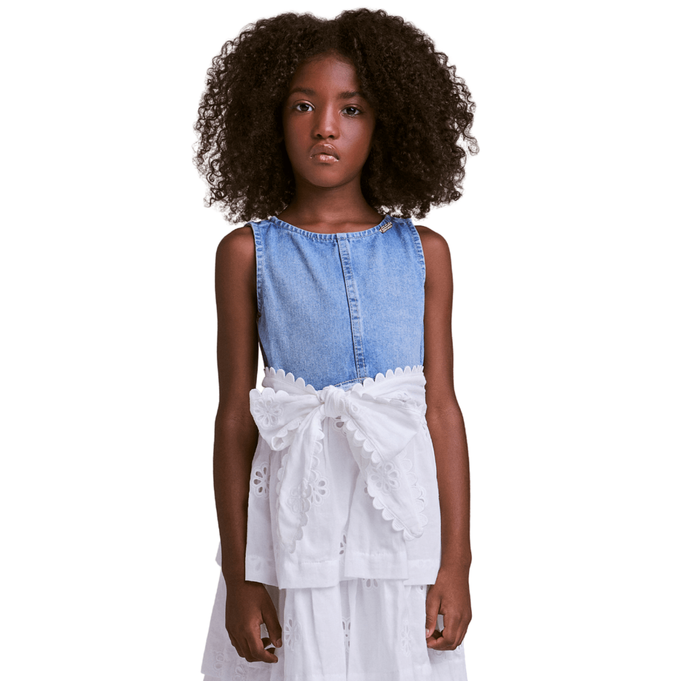 A parte superior em jeans traz um toque contemporâneo e versátil, com caimento leve que não aperta e garante bem-estar durante todo o uso. Já a saia em lese branco, com detalhes bordados e camadas fluídas, acrescenta um ar romântico e sofisticado ao look, transformando o vestido em uma peça perfeita para composições casuais e especiais.