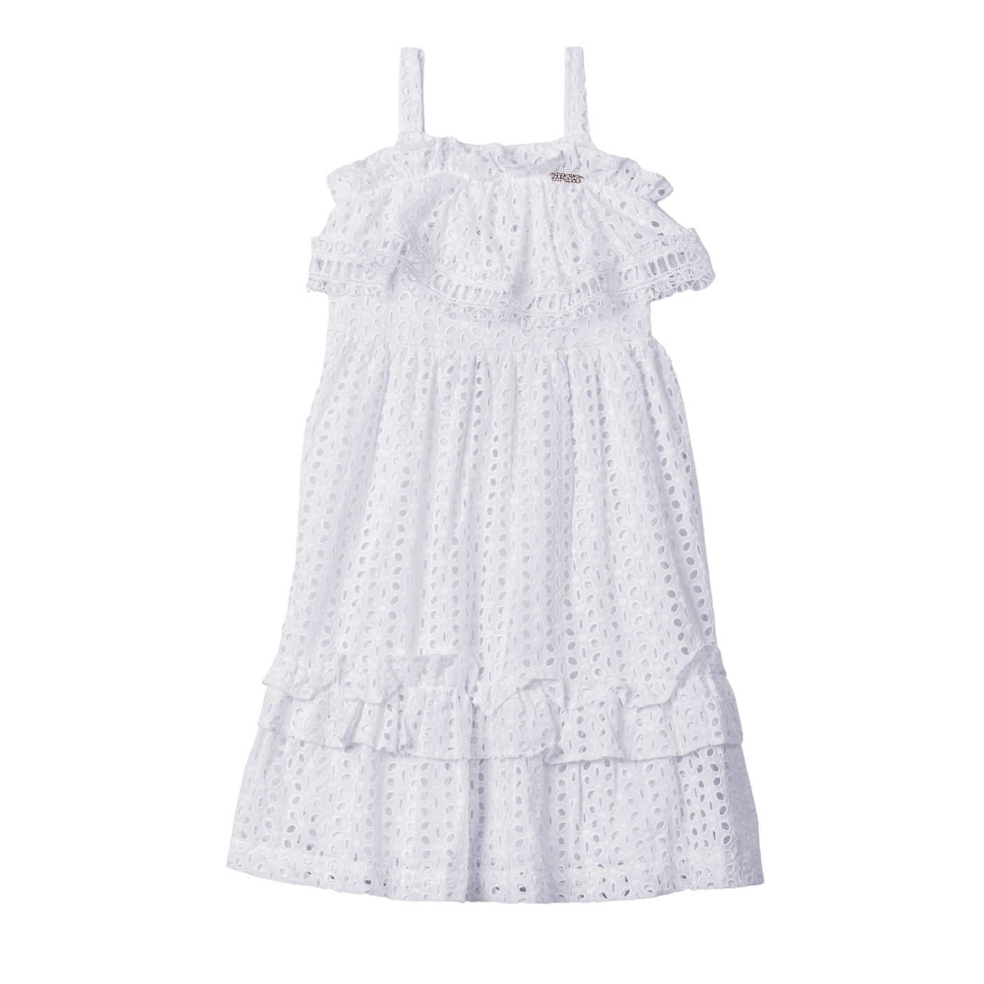 Com modelagem mais solta e comprimento midi, o vestido conta com alcinhas com babados, barra em camadas e detalhes vazados que deixam o look leve e sofisticado. O caimento é confortável e fresquinho, perfeito para dias de verão, festas, ensaios fotográficos, aniversários ou até como opção para daminha moderna.
