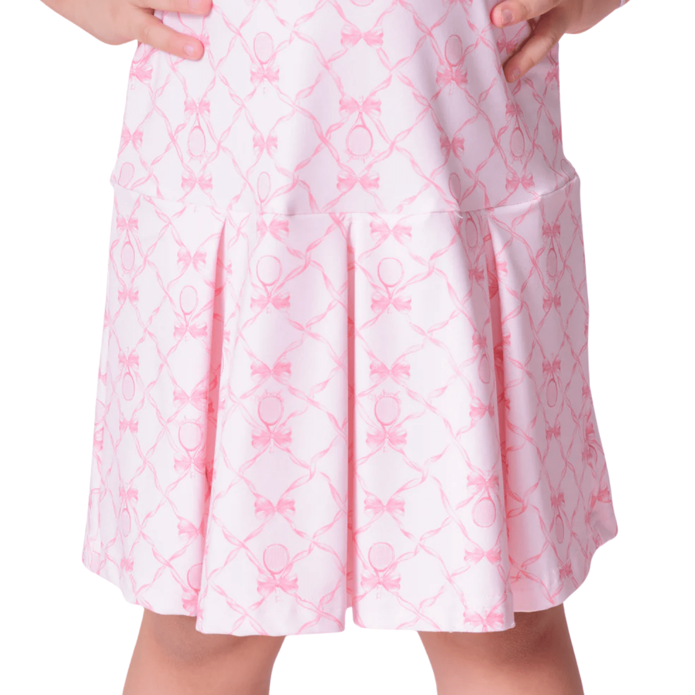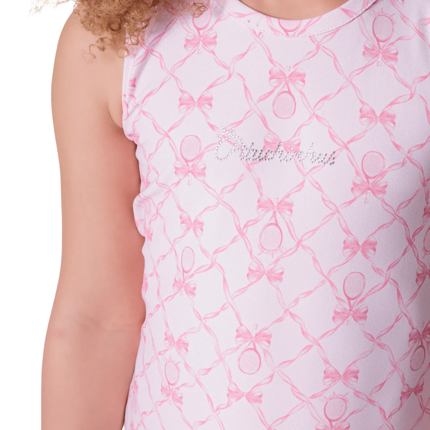 Confeccionado em tecido leve e macio, o vestido apresenta estampa exclusiva de laços e raquetes em tom rosado suave sobre fundo branco, garantindo um visual refinado e romântico.