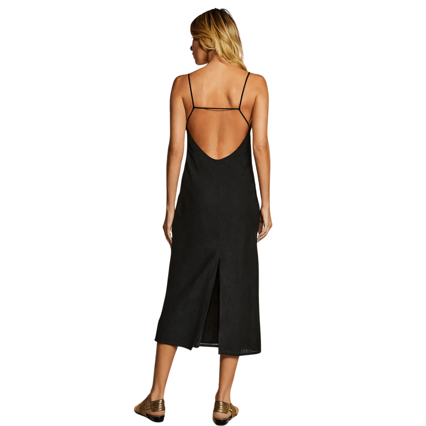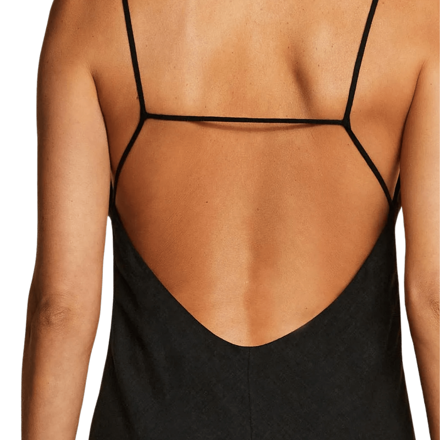 Com decote reto e alças finas, ele valoriza a parte superior do corpo com simplicidade e feminilidade. O decote profundo nas costas acrescenta um toque sensual e moderno, enquanto a fenda traseira na saia garante movimento, fluidez e charme extra à silhueta.