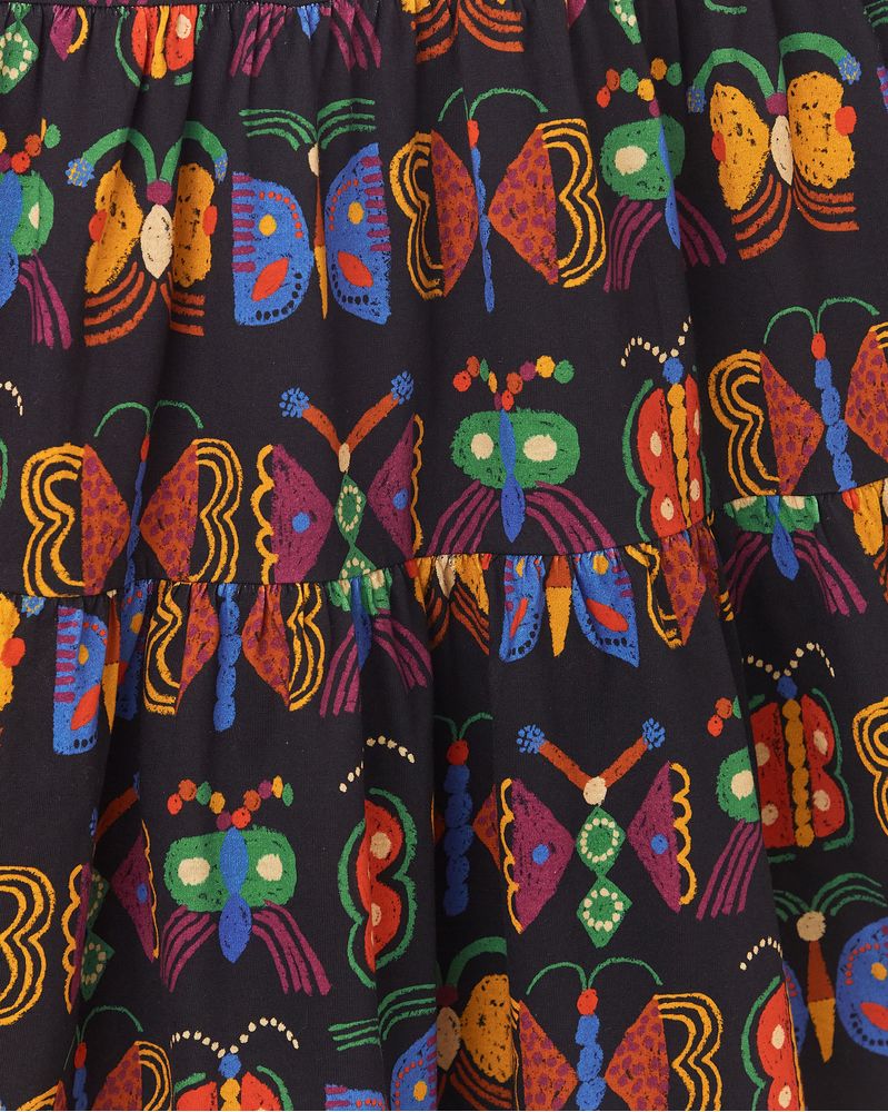 Mas o verdadeiro destaque está na estampa Borbocosmo, que encanta com suas borboletas coloridas sobre fundo preto. A composição une o brilho das cores vivas com a intensidade elegante do fundo escuro, criando um contraste cheio de estilo que exala criatividade, liberdade e poesia visual. As borboletas parecem ganhar vida na superfície do vestido, representando transformação, leveza e a beleza de voar com a imaginação.