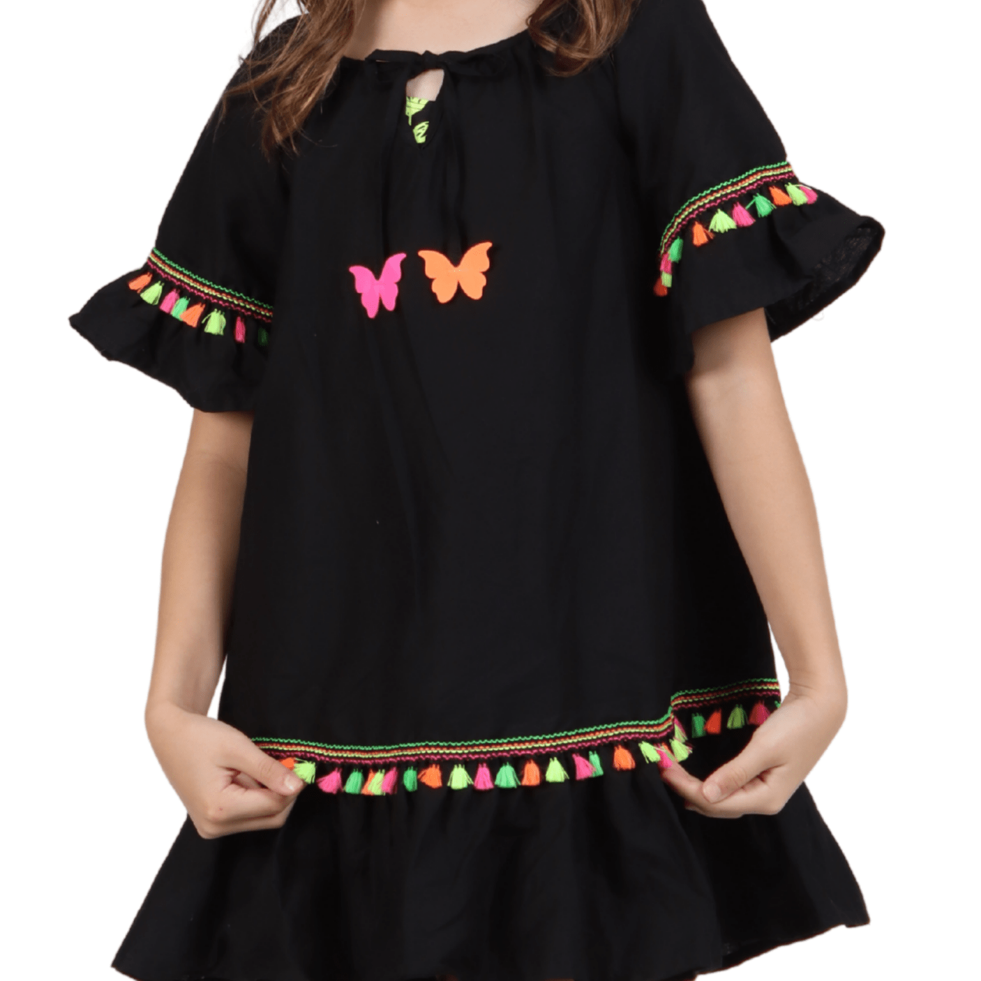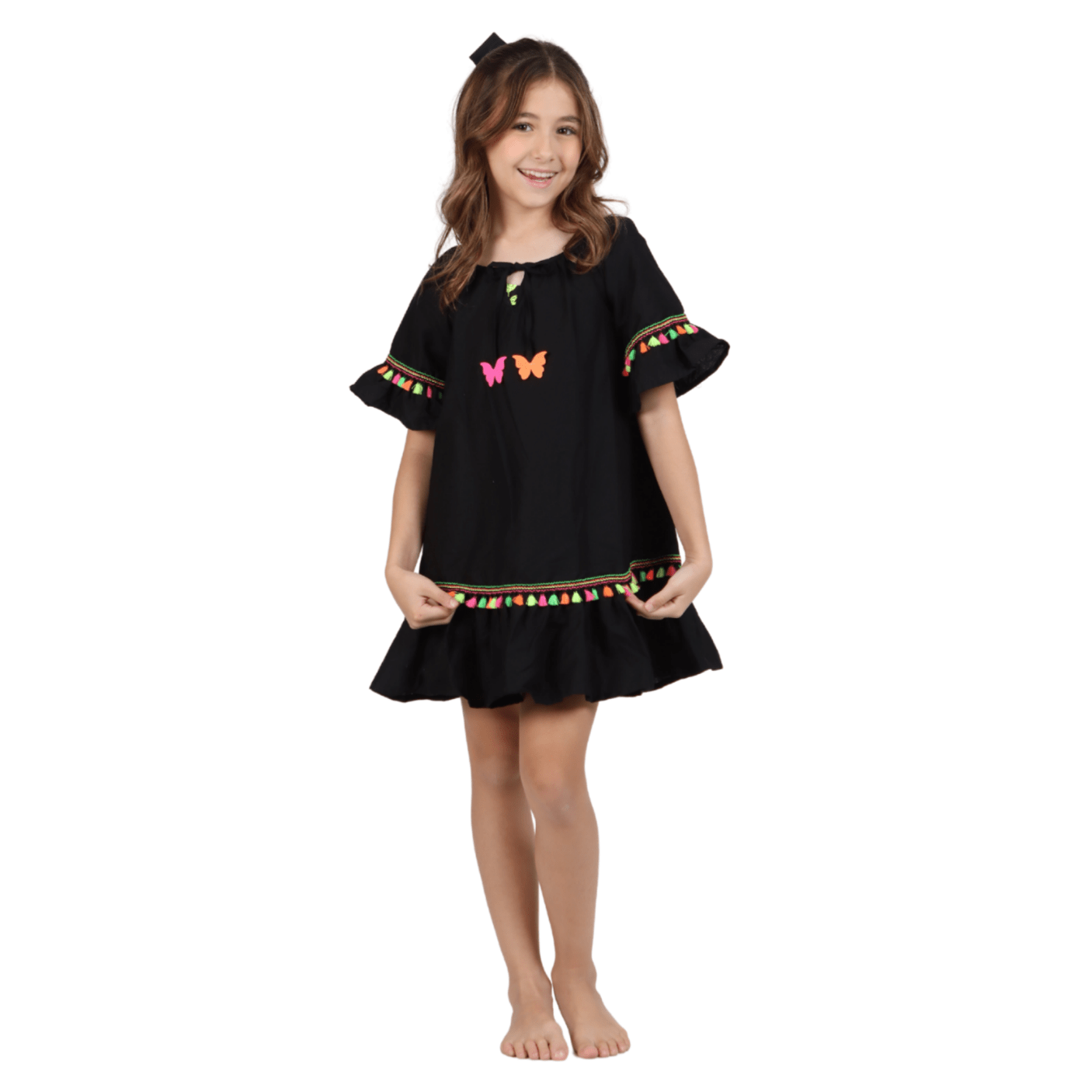 O design traz um toque delicado e alegre com as aplicações coloridas de borboletas na parte frontal, além dos detalhes em pompons neon nas mangas e na barra, que deixam o visual descontraído e divertido. O modelo ainda conta com decote ajustável por amarração, mangas curtas com babadinhos e barra rodada, que proporcionam movimento e leveza ao look.