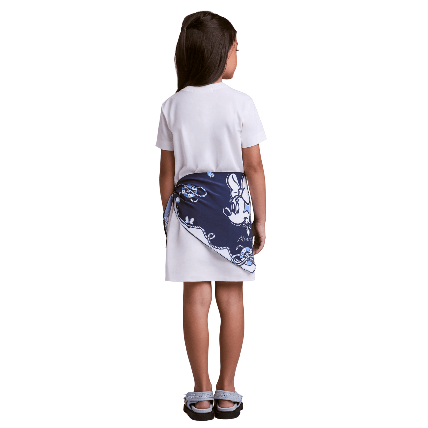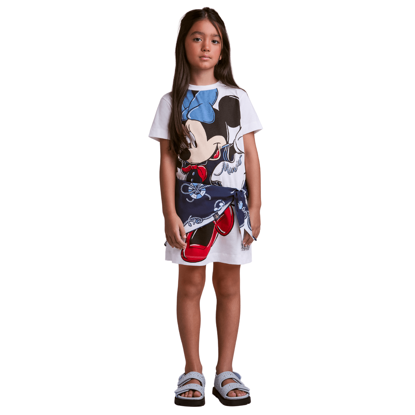 Com design divertido e charmoso, a peça apresenta estampa exclusiva da Minnie Mouse em tamanho maxi, que garante personalidade e alegria ao look. O detalhe do lenço azul marinho com estampa náutica adiciona sofisticação e referência navy, deixando a produção ainda mais estilosa e atual.